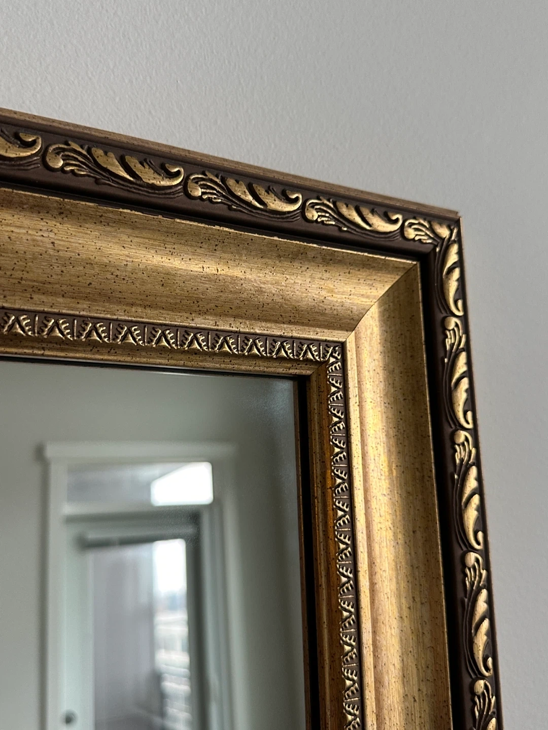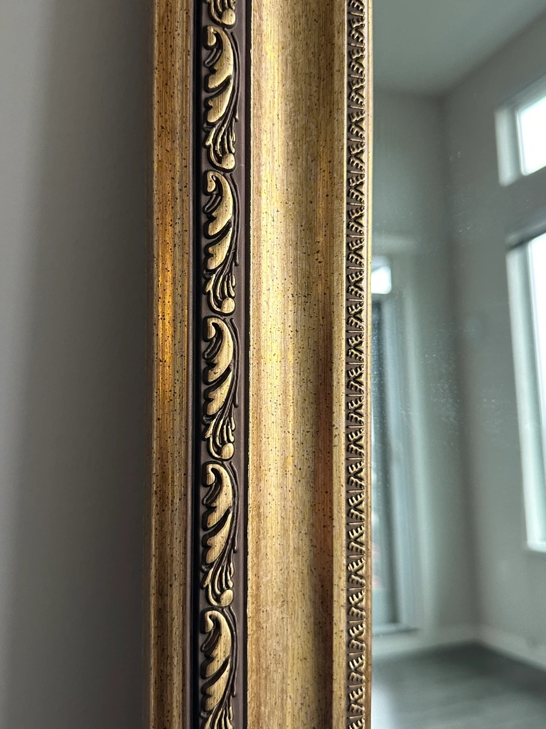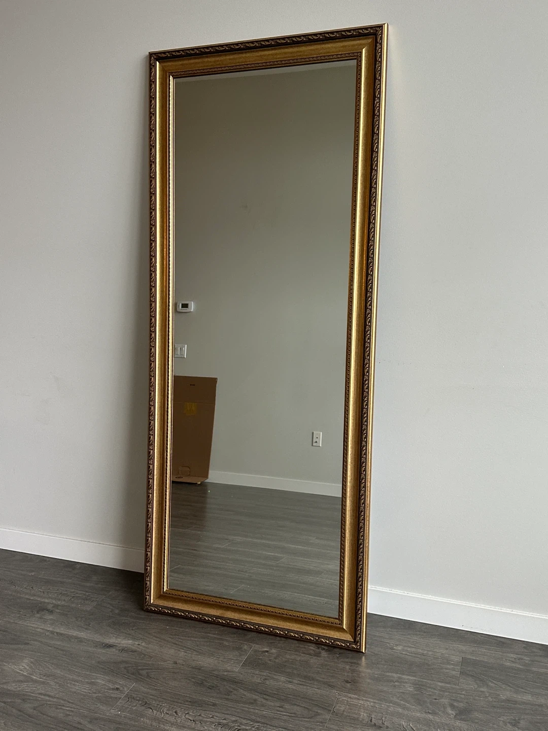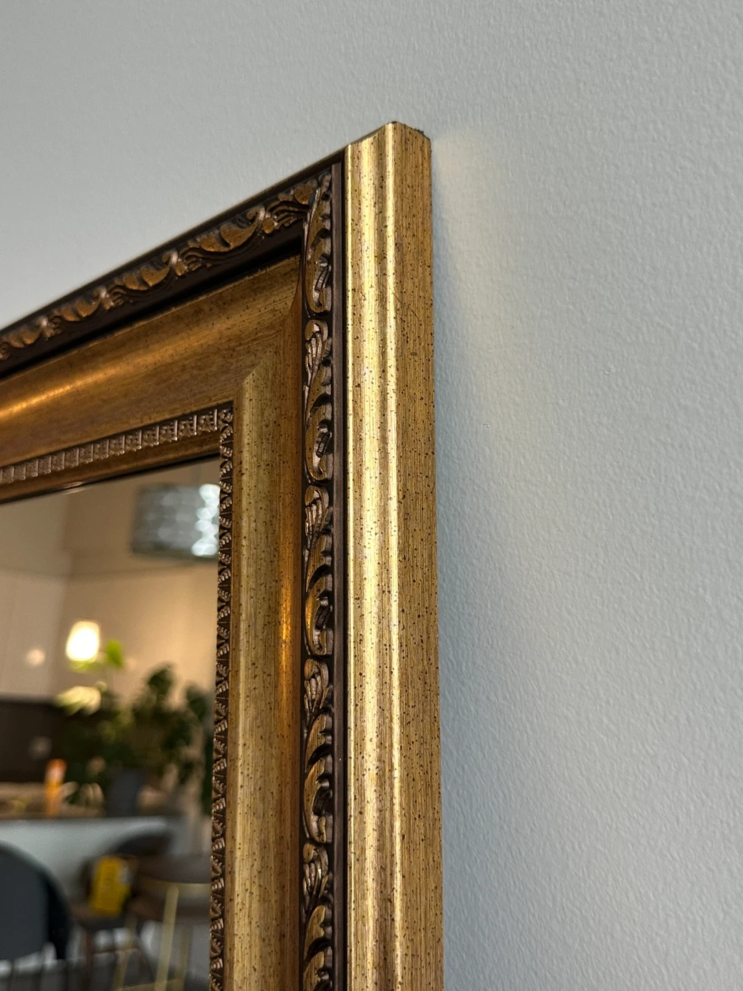 Magnificent oversized full-length mirror with an elegant aged gold ornate frame. Almost new.