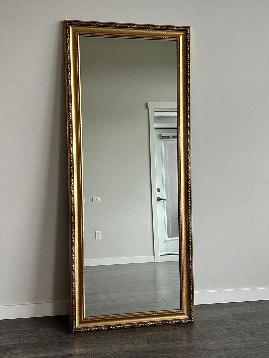 Magnificent oversized full-length mirror with an elegant aged gold ornate frame. Almost new.