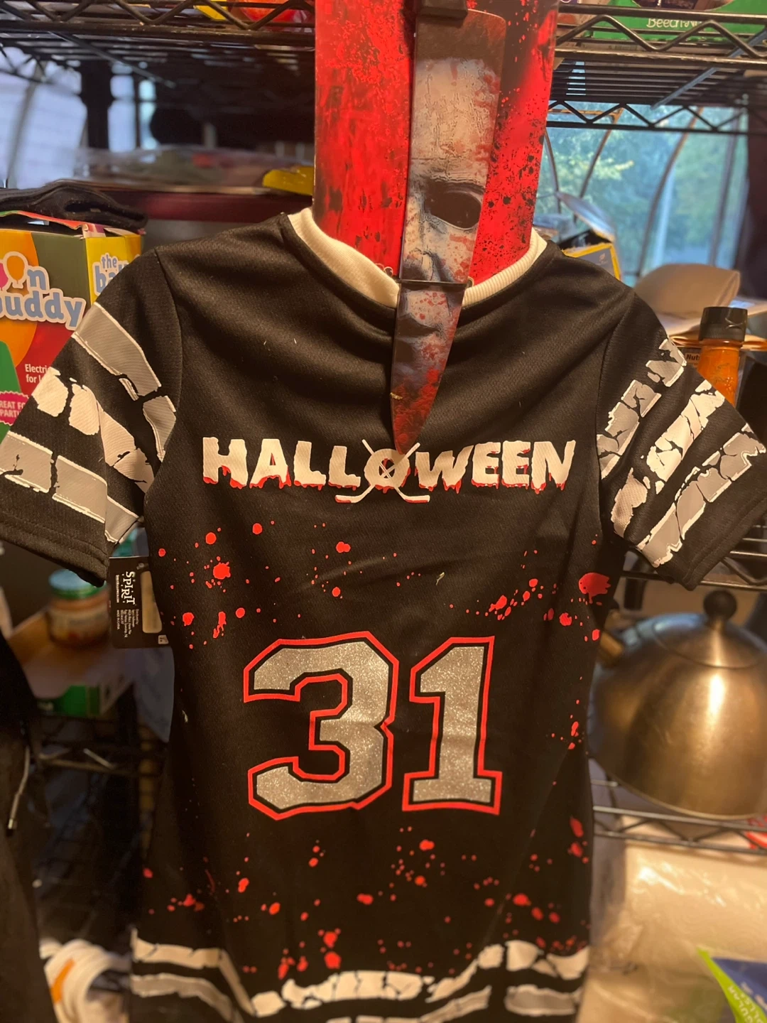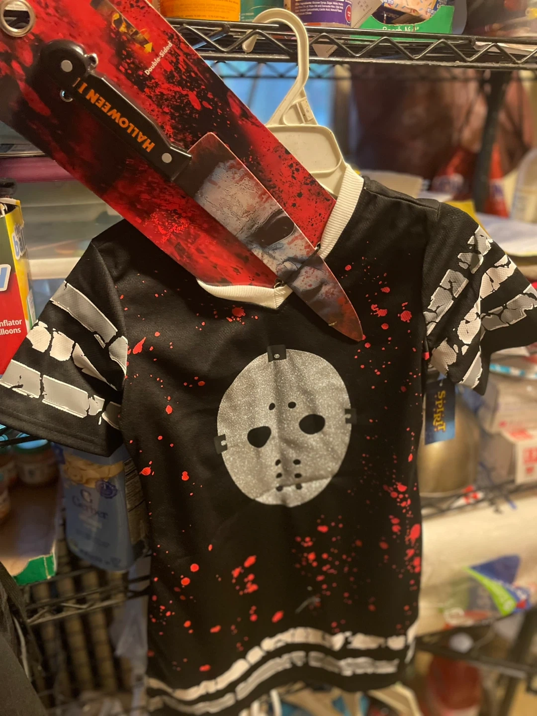 Selling a Halloween themed t-shirt dress . It's black with white and gray accents, perfect for the spooky season! Also comes with brand new Halloween knife size 7/8