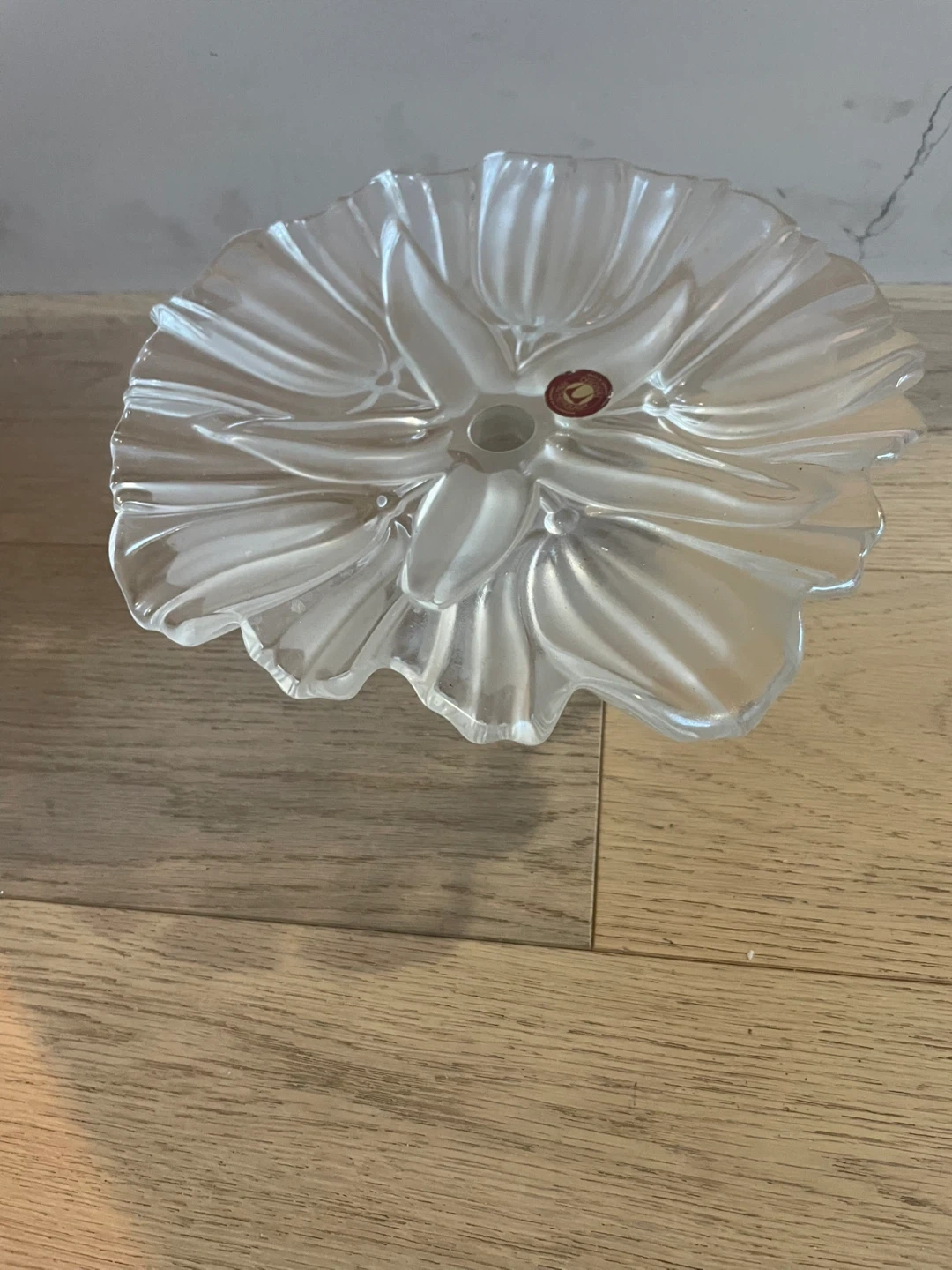 This is a clear glass cake stand with a fluted edge design. Its frosted stem provides a nice contrast to the clear glass. It's perfect for displaying desserts or appetizers at any gathering!