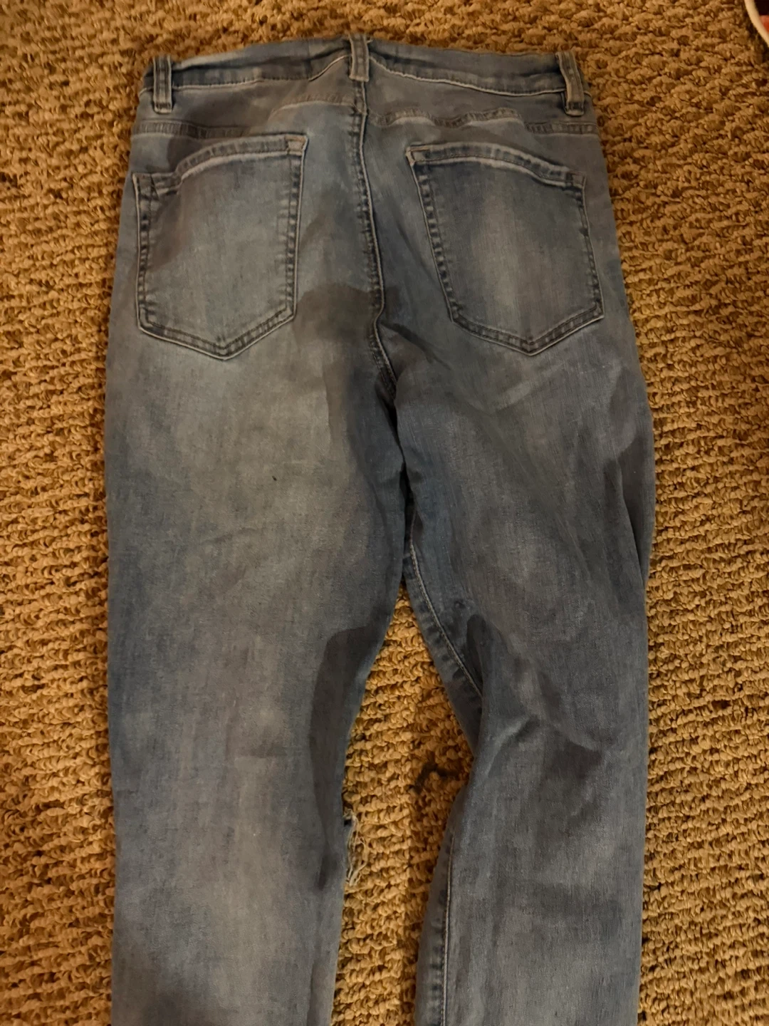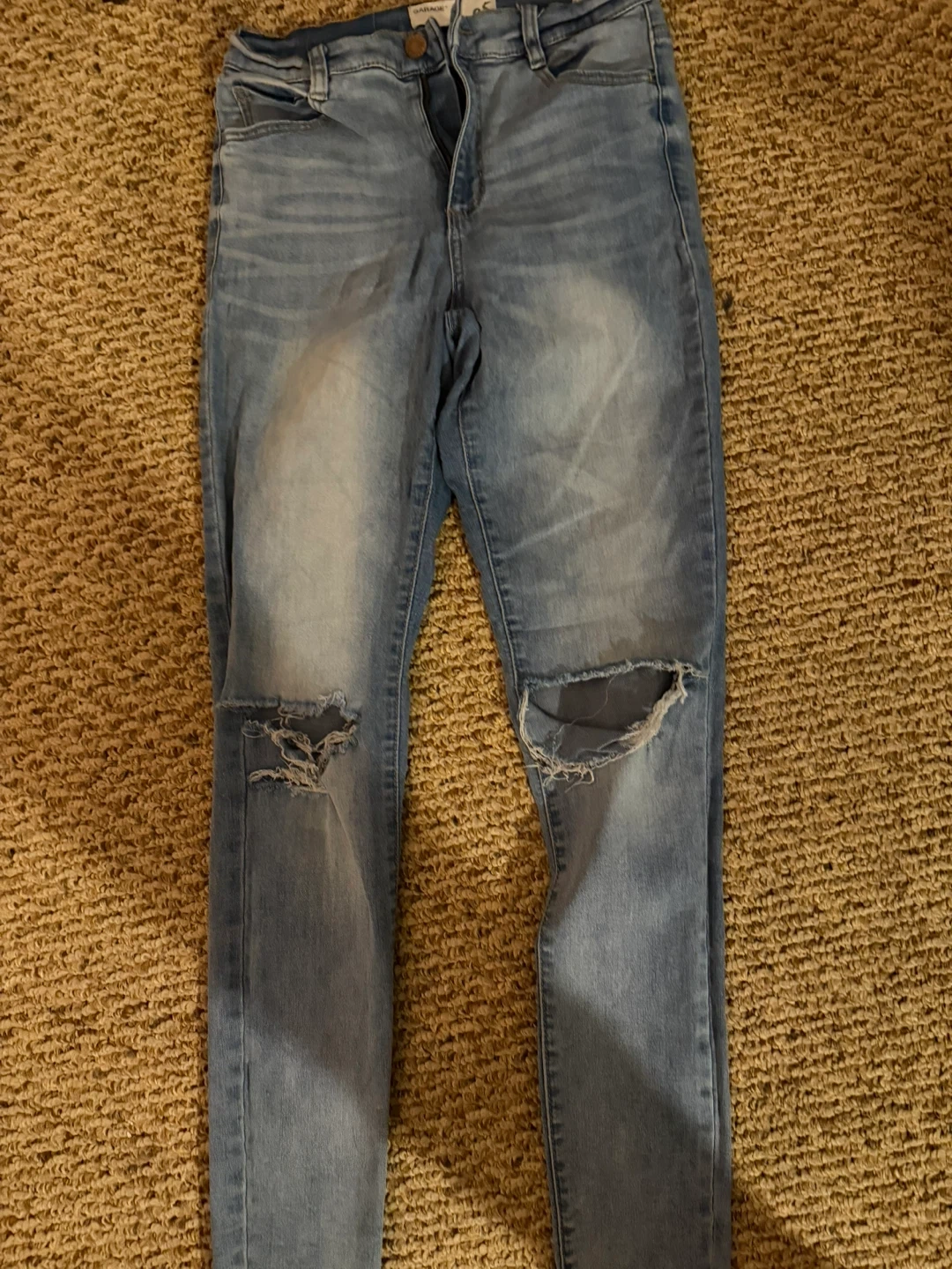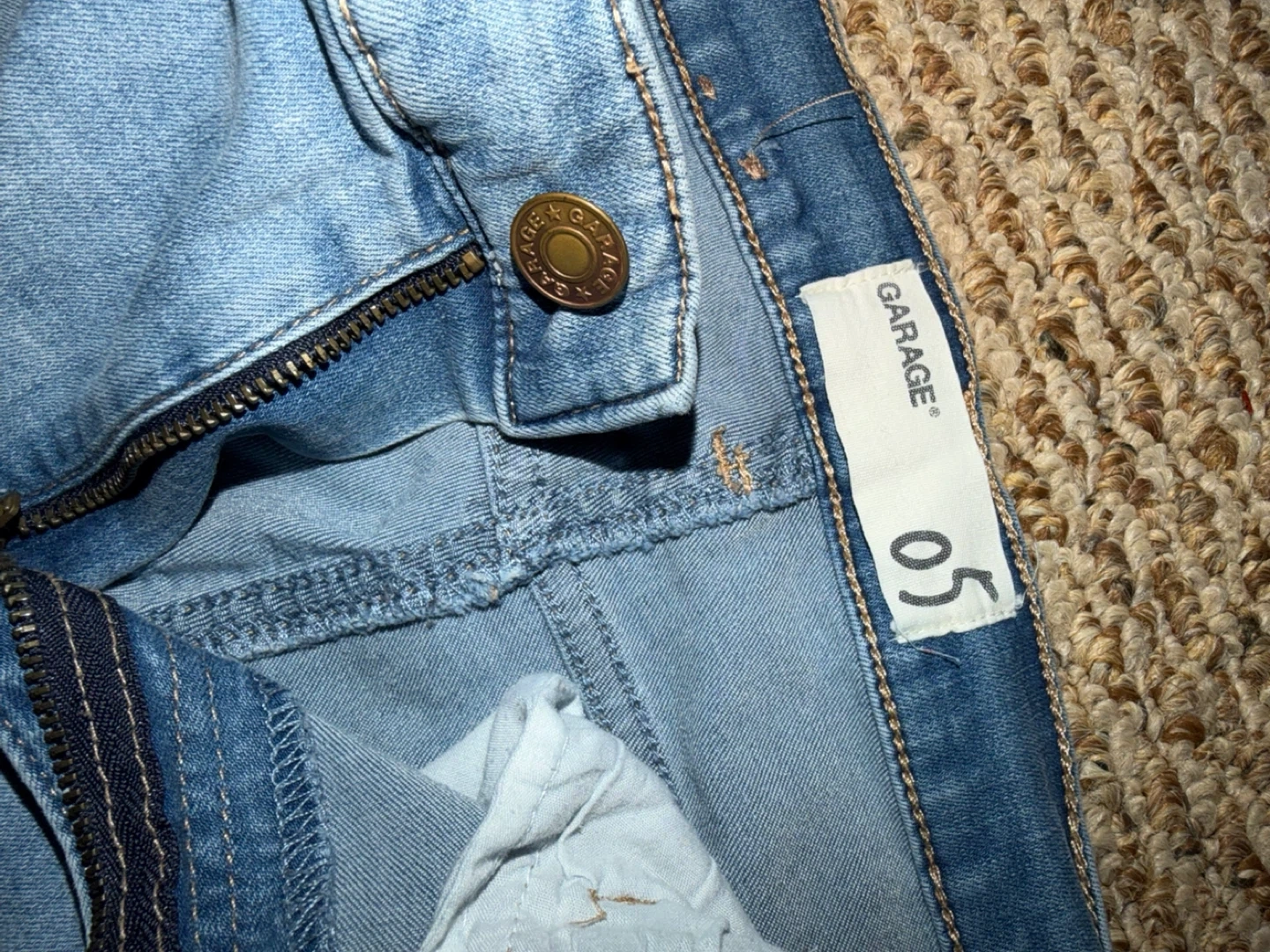 These are Garage women's light wash denim jeans with ripped knee details. They're a size 05. Made from a denim material. Perfect for casual wear!
