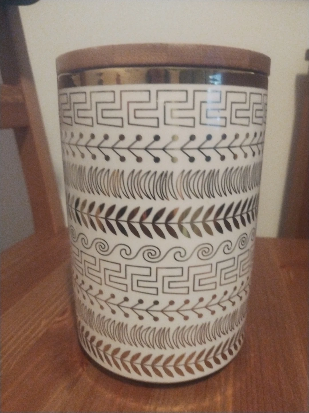 This decorative canister features a white ceramic body with a repeating Greek key and floral pattern in gold and black. It includes a matching wooden lid. It's perfect for storing small items or as a decorative accent piece.