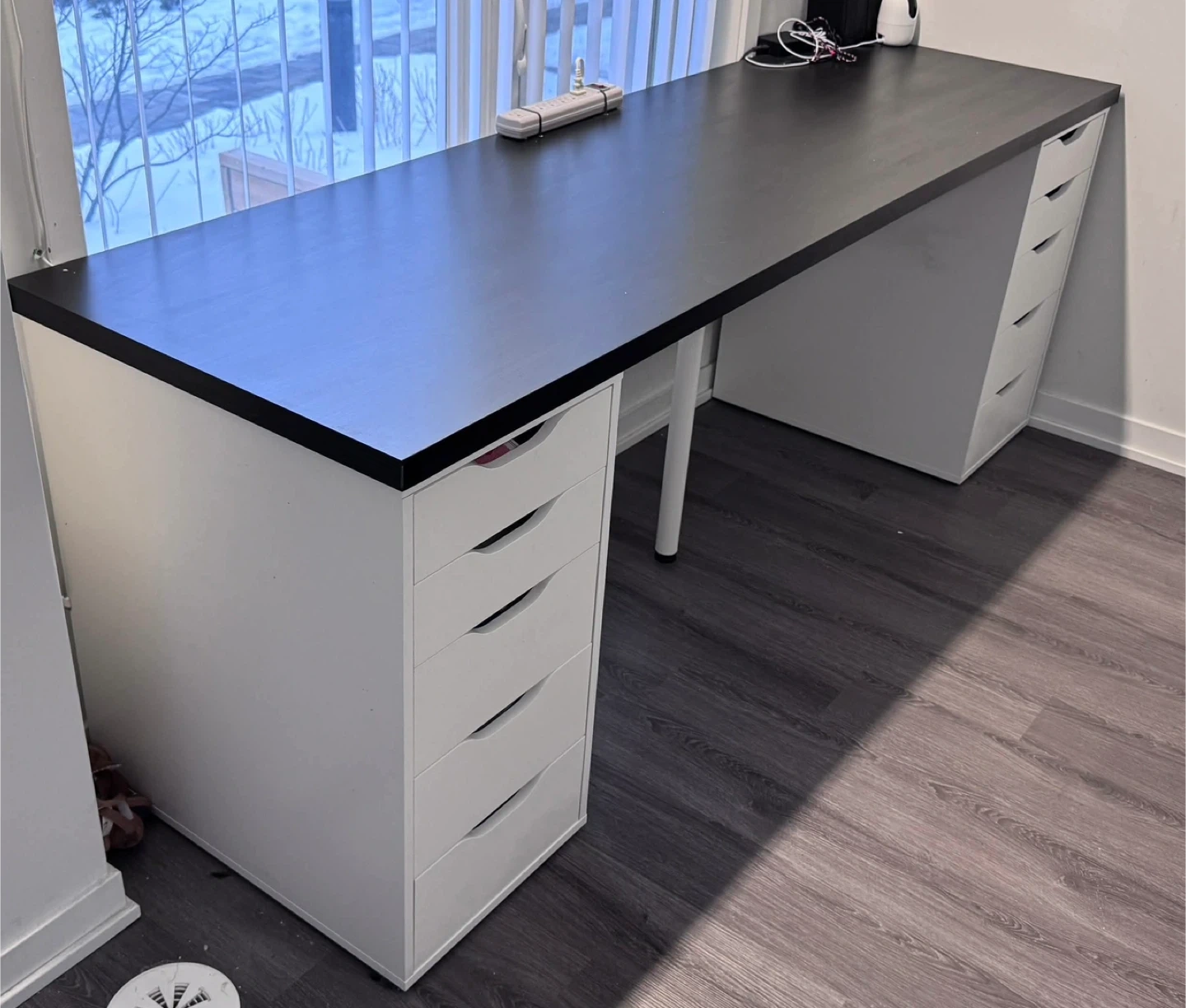 Spacious desk with a black top and white IKEA Alex drawer units on each side. It's 200 cm long and 73 cm high. Plenty of storage space is available!