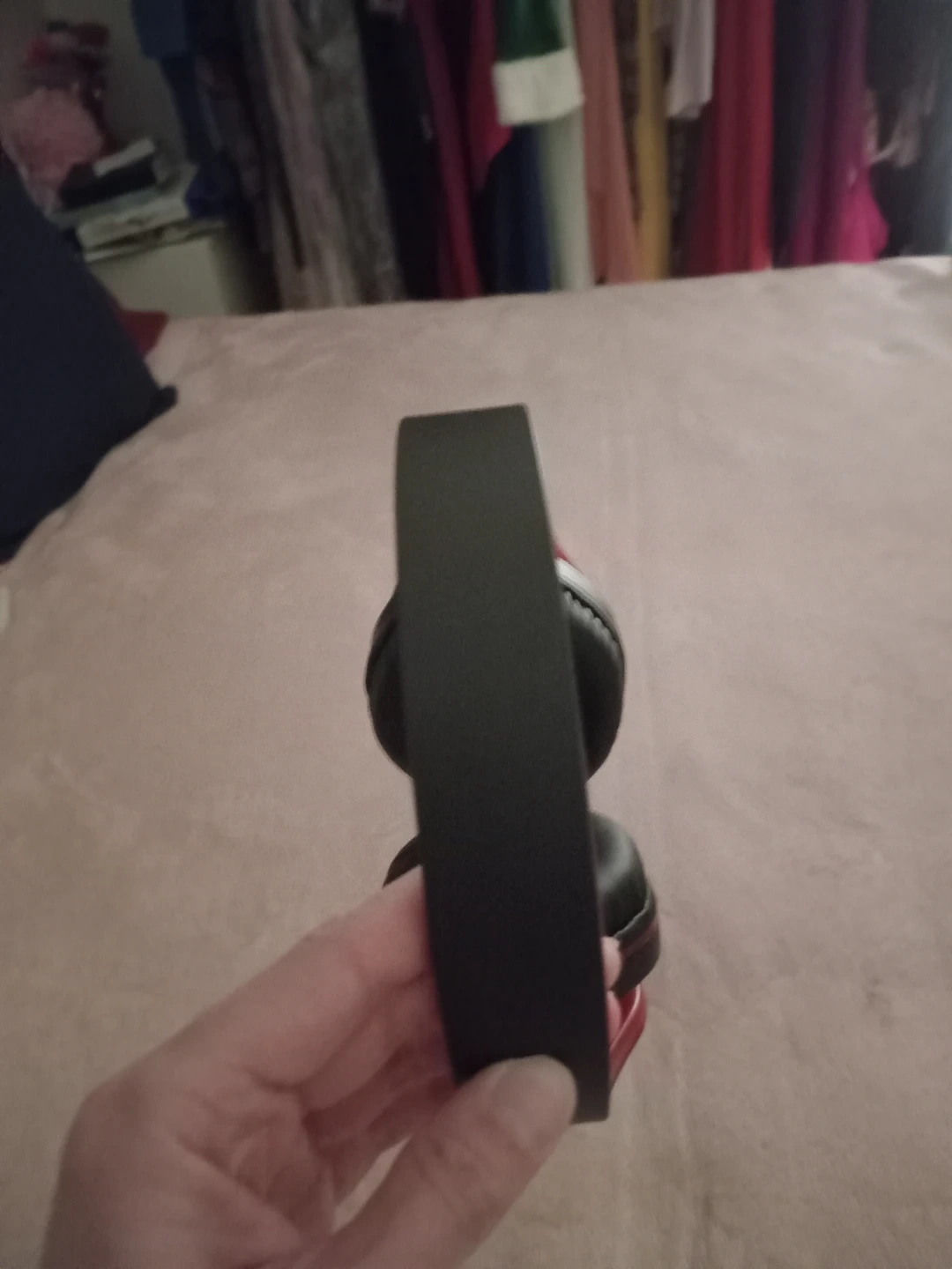 ZIHNIC over-ear headphones in red and black. These foldable headphones come with a protective zippered case. They're comfortable for extended wear. Also comes with a charging cable.