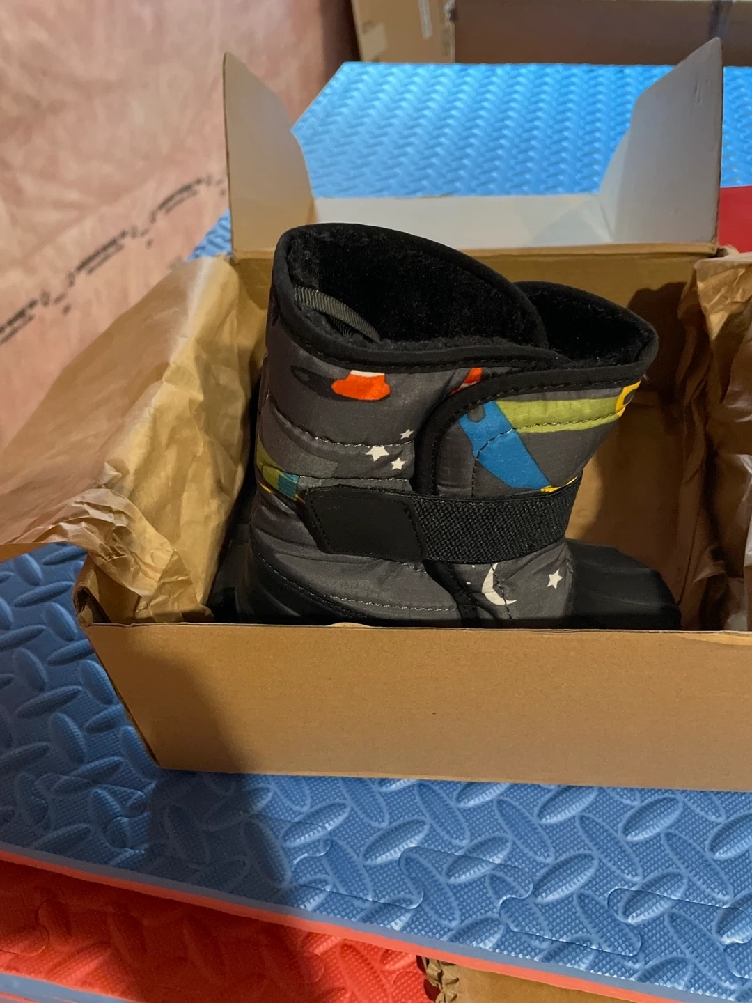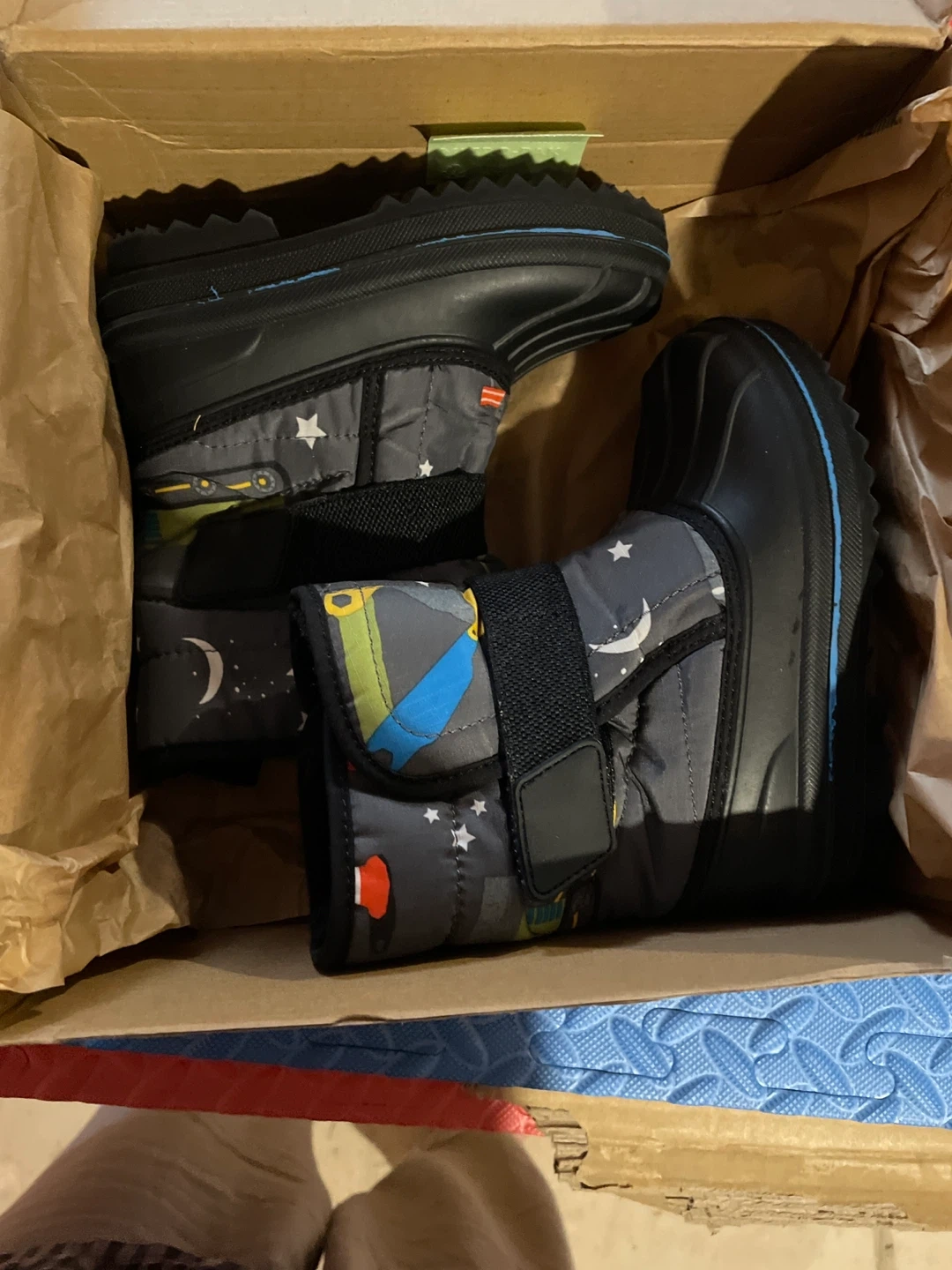 Warm and cozy winter boots for kids. Features a fun moon and star pattern. Easy velcro closure for a secure fit. These boots are perfect for keeping little feet toasty on cold days!