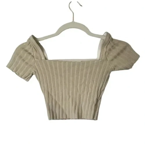 Cream Princess Polly cropped baby tee. Slim fitting, knit ribbed material. Features an inner silicone strip along shoulders and a wide neckline. Unlined.
