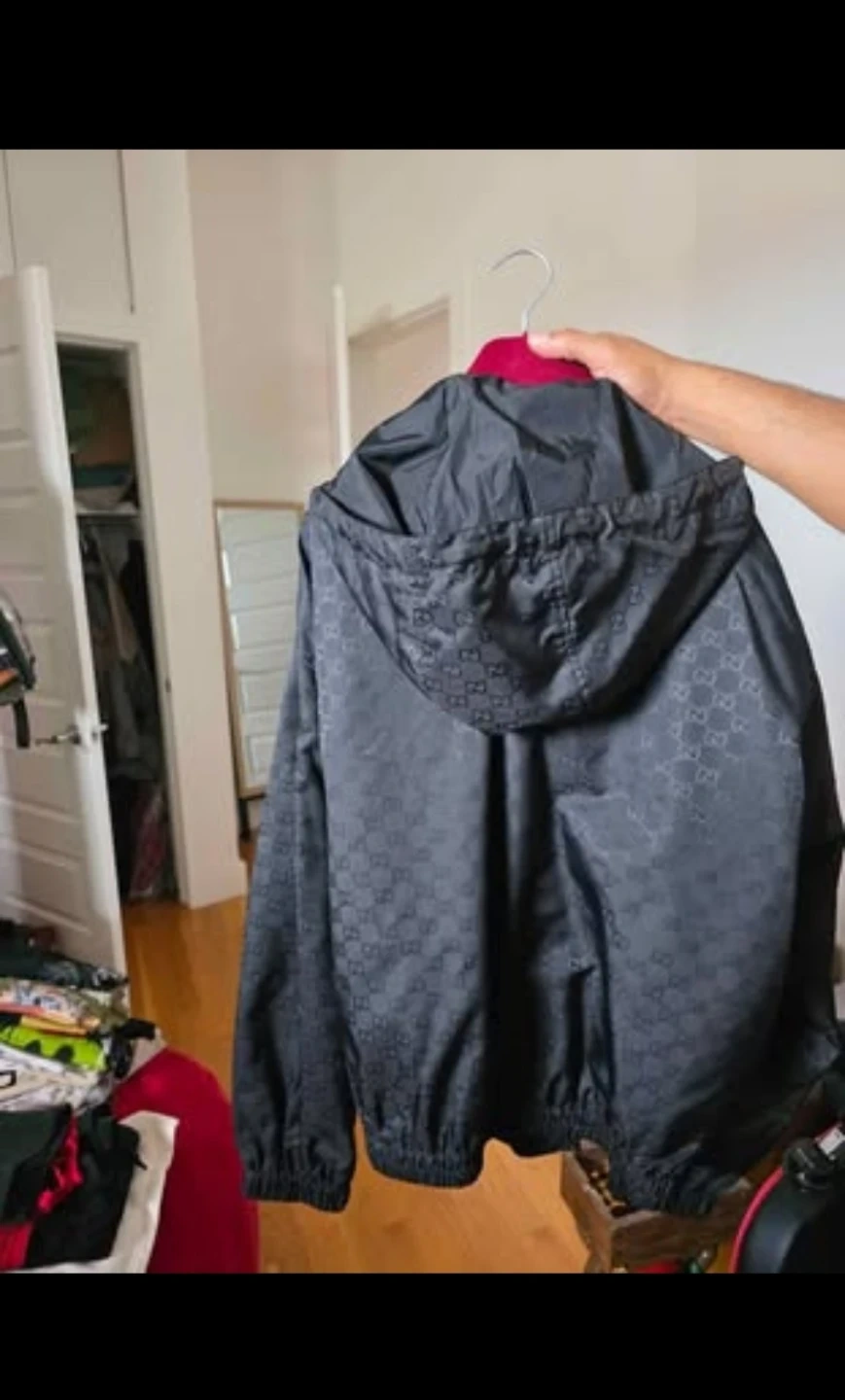 Black Gucci windbreaker jacket with allover GG monogram pattern. Features a full zip closure and a hood. Made in Italy. It's lightweight and perfect for transitional weather! Fit Large