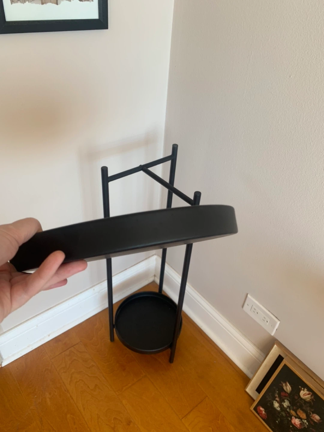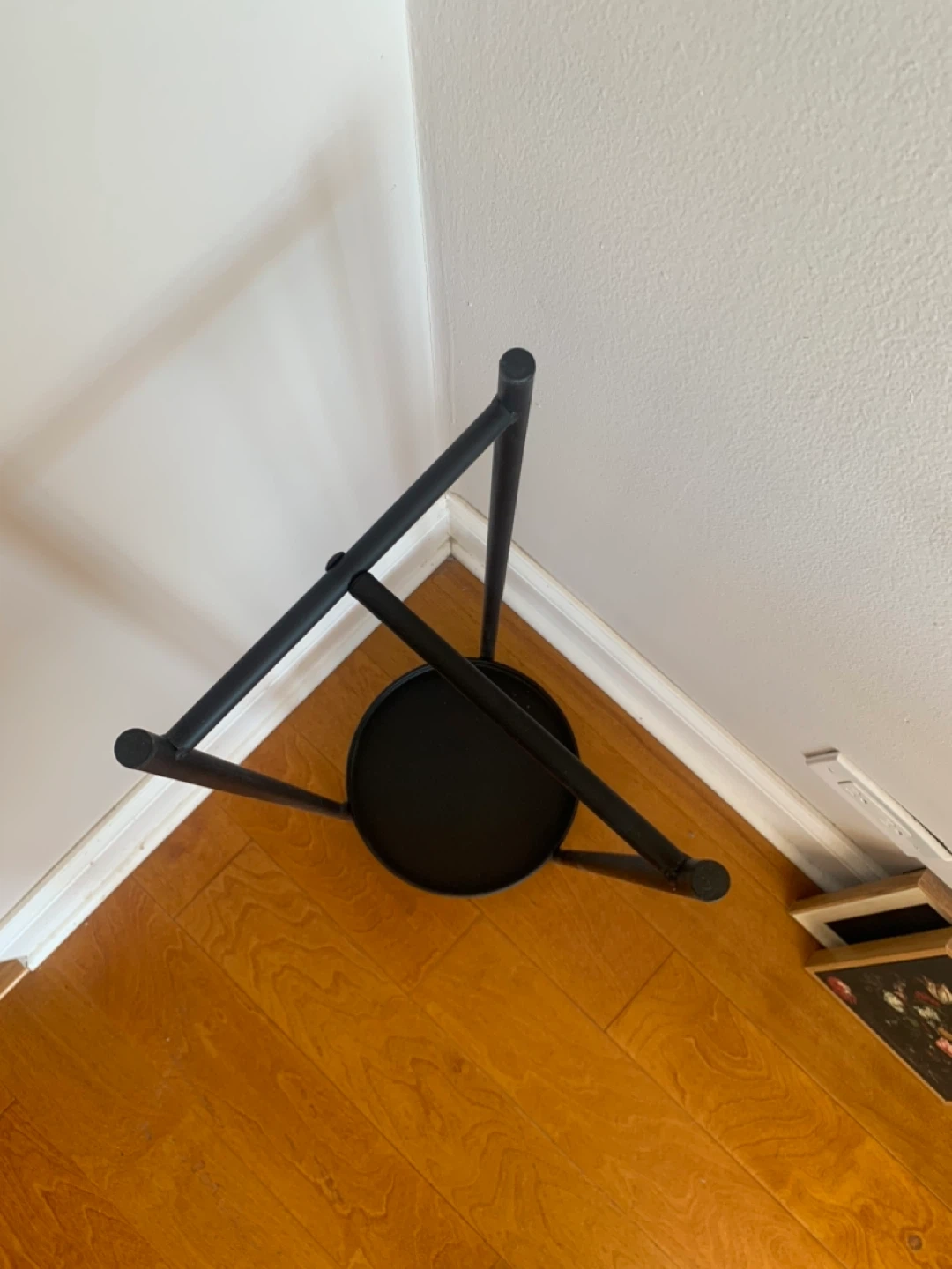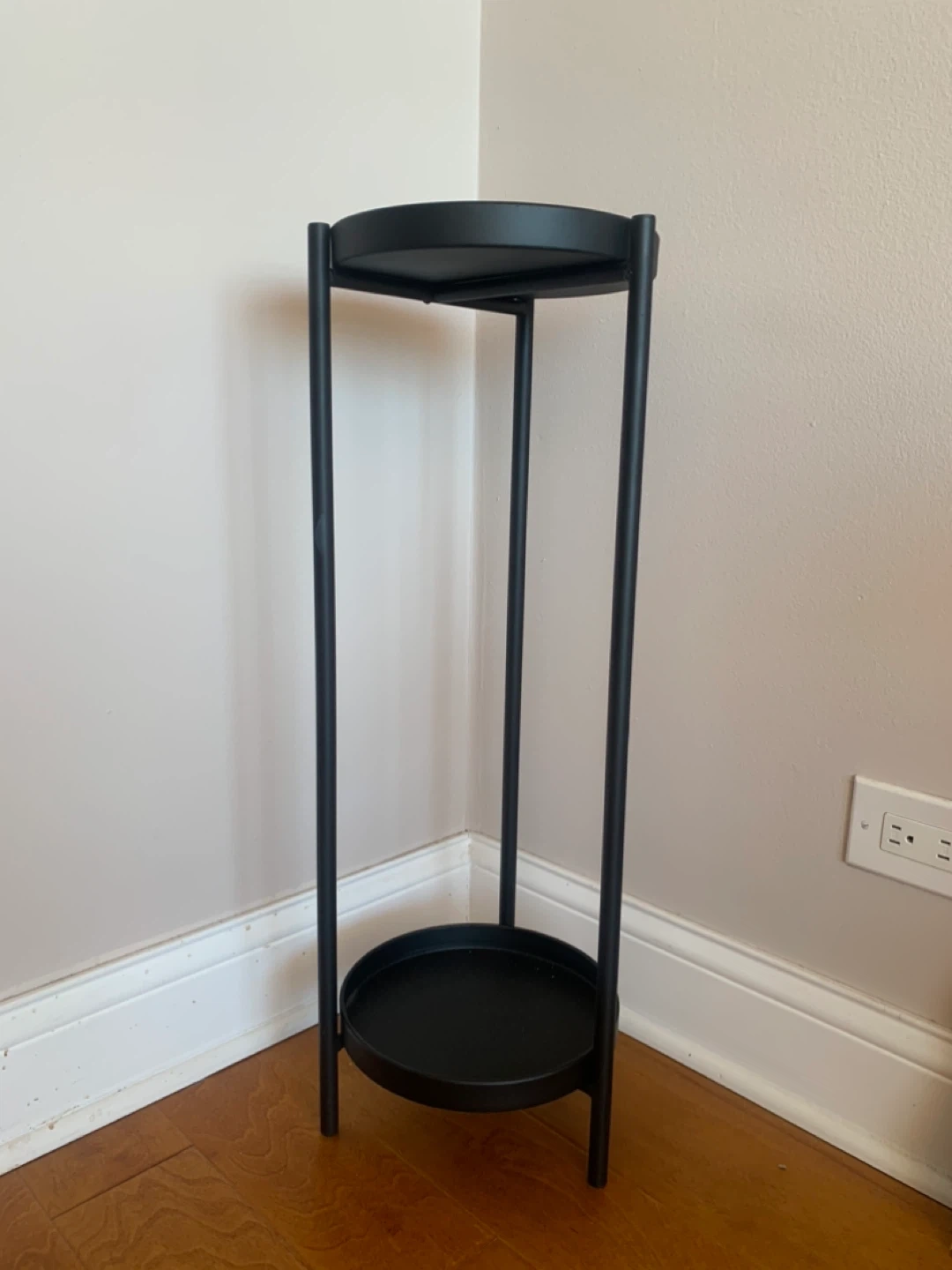 Beautiful minimalist plant stand originally purchased from HomeGoods. This is metal piece - not plastic. It has a sleek matte black finish that fits perfectly with modern, industrial, or mid-century decor.