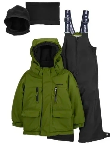 This OshKosh B'gosh winter set includes a green hooded jacket and black snow pants. It's perfect for keeping kids warm and dry during cold weather. The set comes with a matching balaclava and neck gaiter.