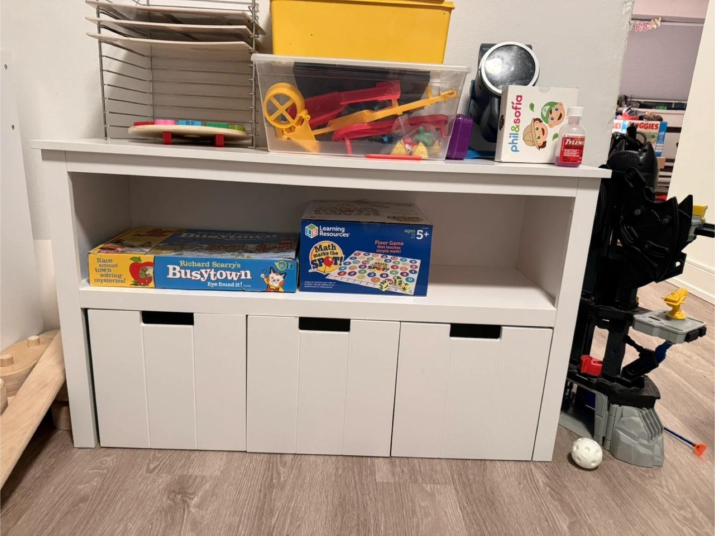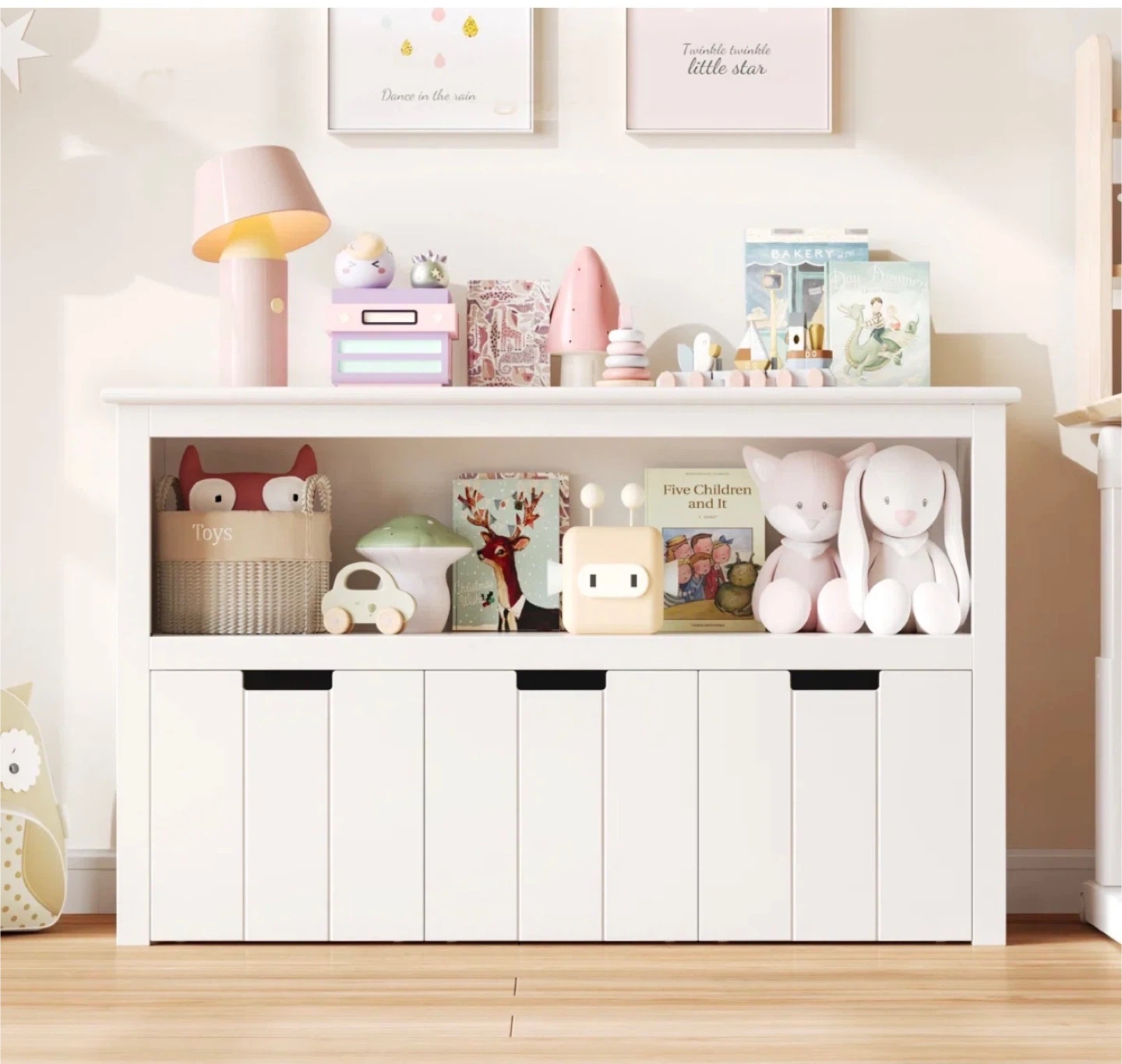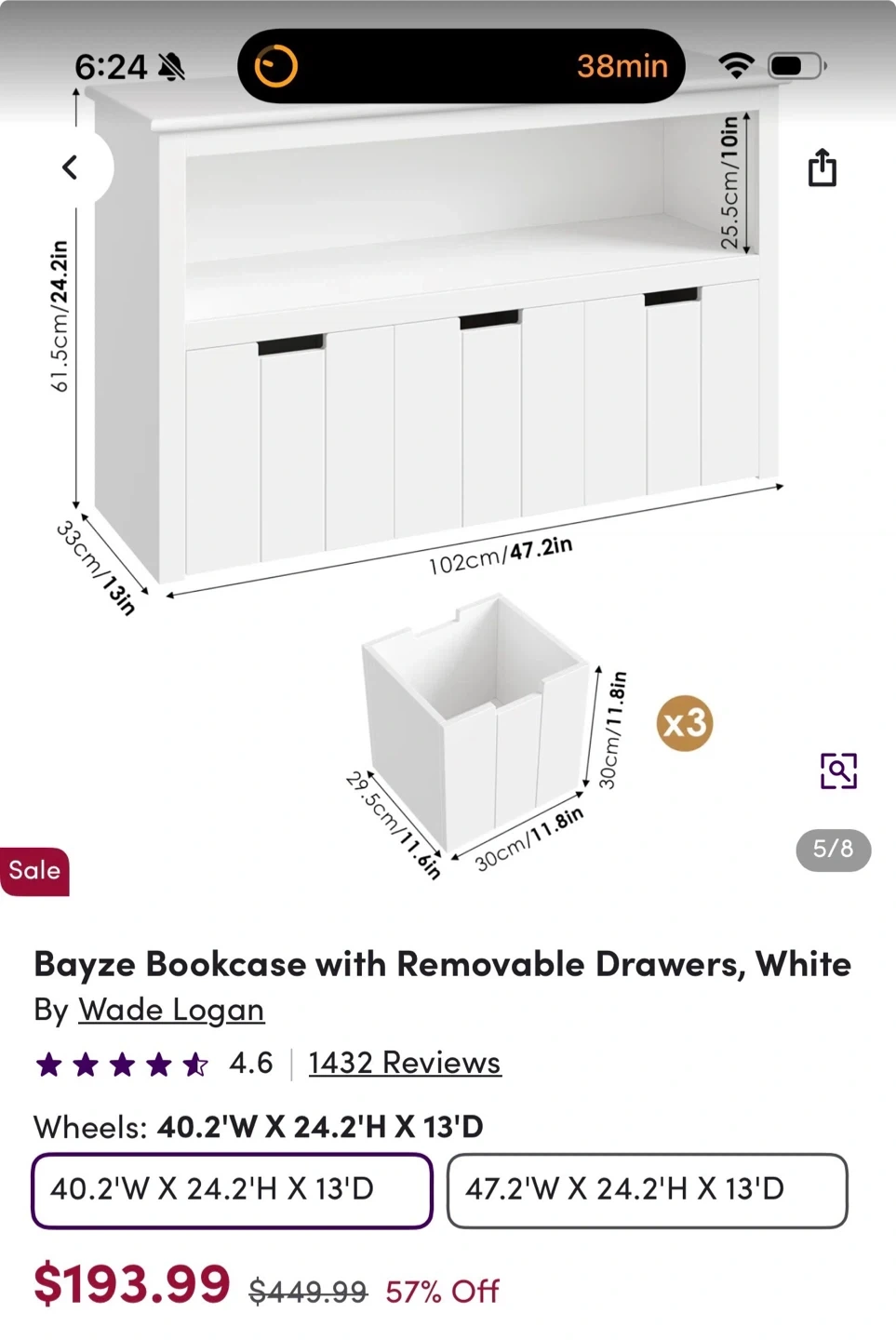 This white bookcase features three removable drawers for storage. The dimensions are 40.2"W x 24.2"H x 13"D. It's great for organizing toys or books in a child's room.