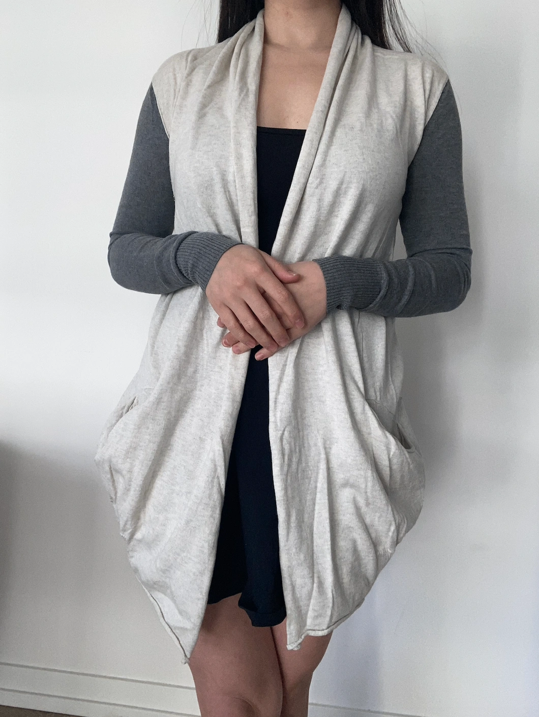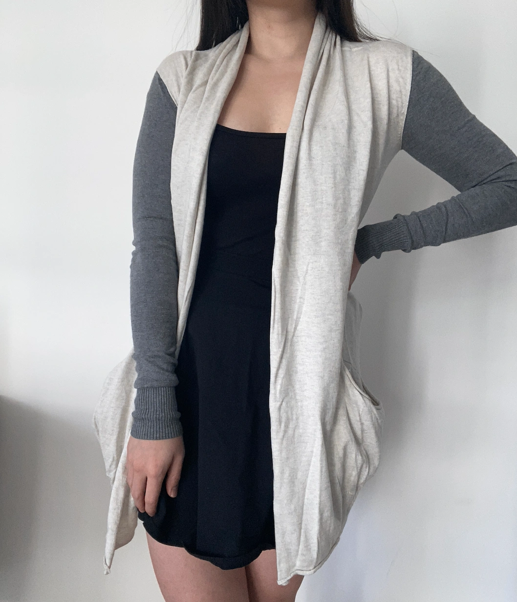 white aritzia cardigan with grey sleeves
