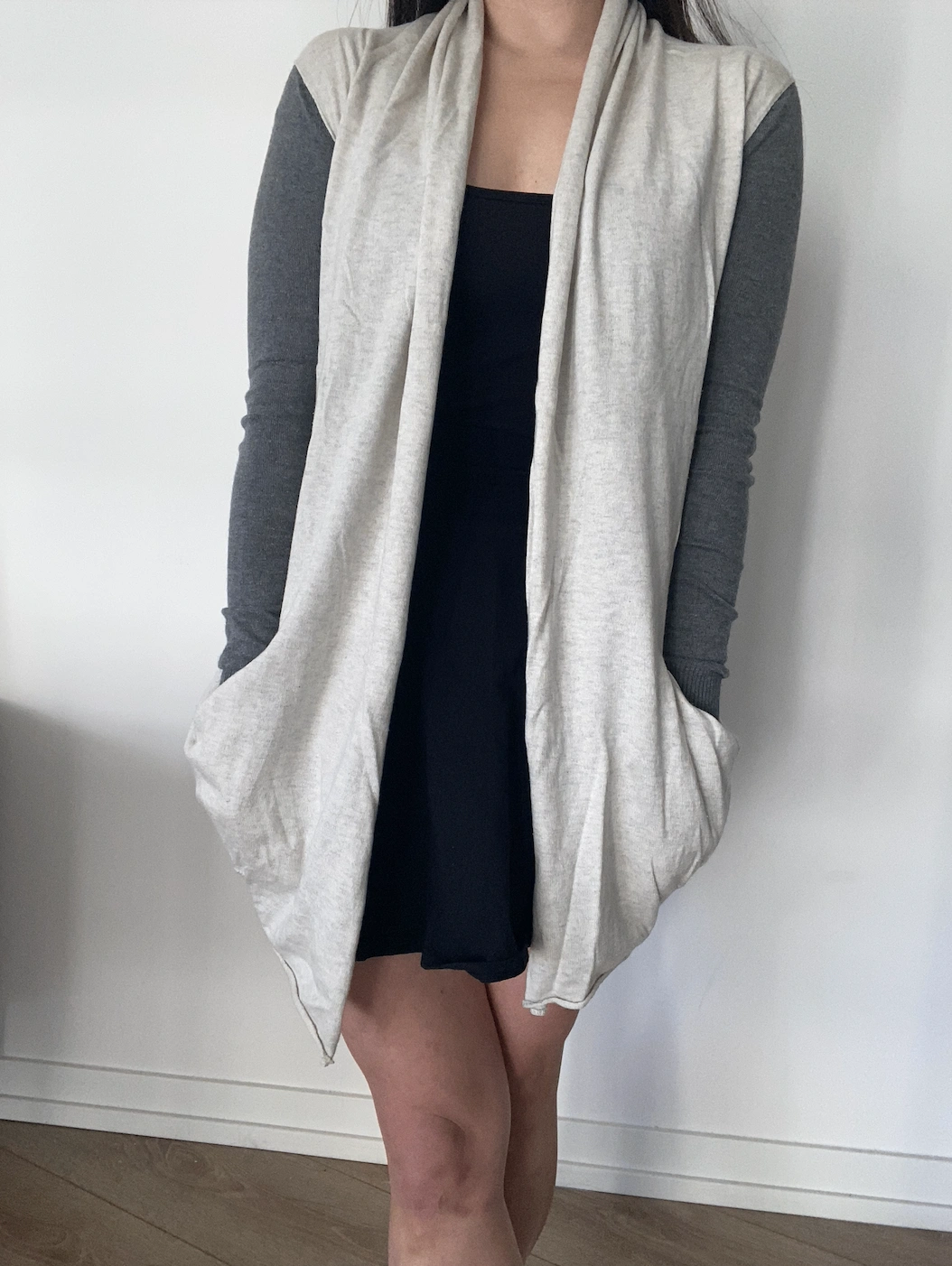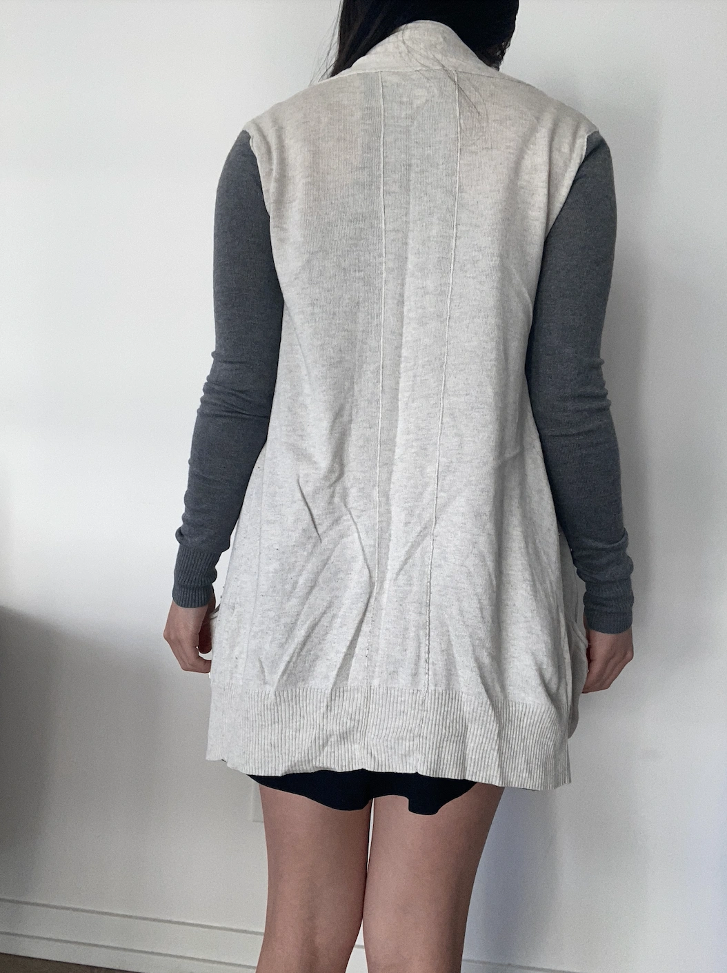 white aritzia cardigan with grey sleeves