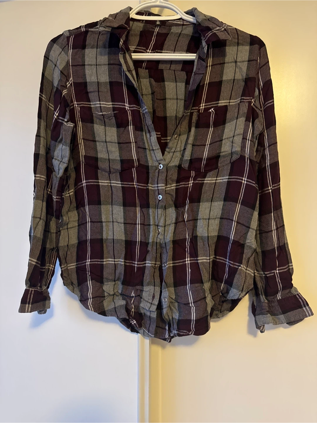 Here's a comfy flannel shirt with a classic plaid pattern! It features a mix of grey and purple tones. Perfect for layering or wearing on its own