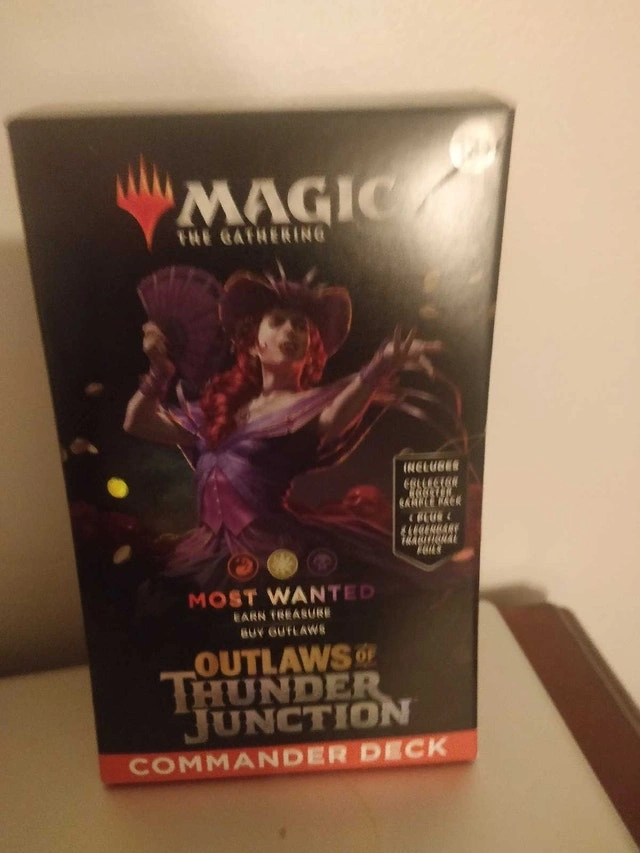 Dive into adventure with this new, ready-to-play Magic: The Gathering Outlaws of Thunder Junction Most Wanted Commander Deck. It contains 100 cards, including 2 traditional foil legendary cards and 98 nonfoil cards. Also included is a Collector Booster Sample Pack and a foil-etched Display Commander. Pick up in Glamorgan, cash only.