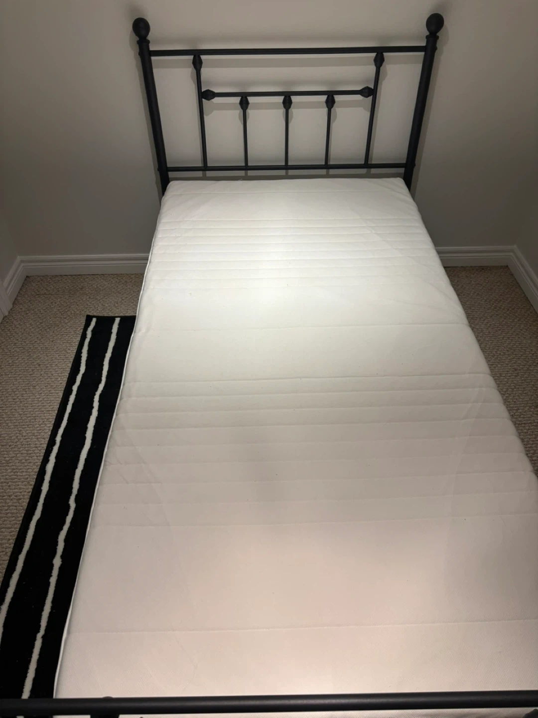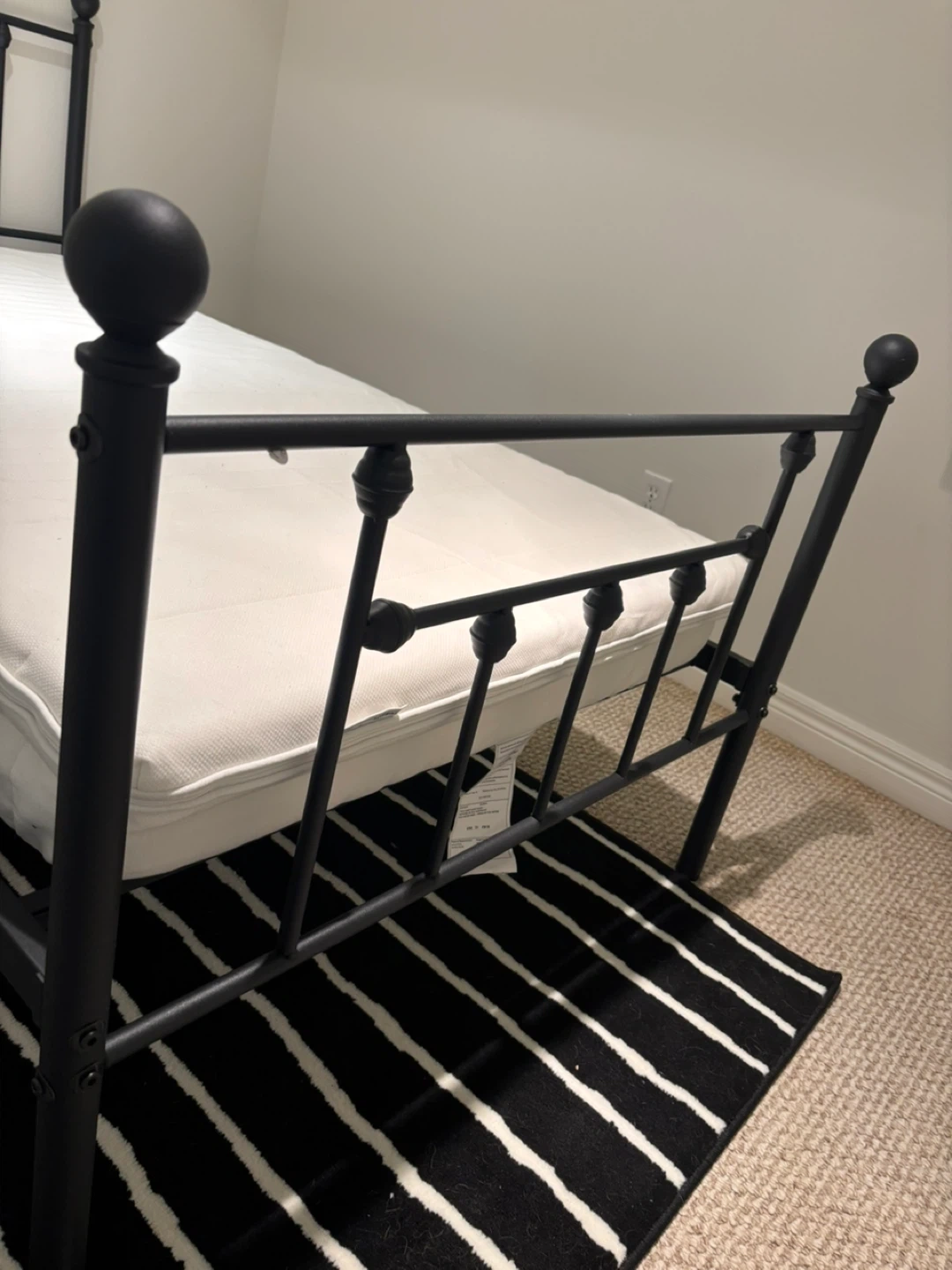 A classic black metal twin bed frame. Sturdy and stylish, it's a great addition to any bedroom! This bed frame is suitable for a twin-sized mattress. Only used for staging. Mattress not included.