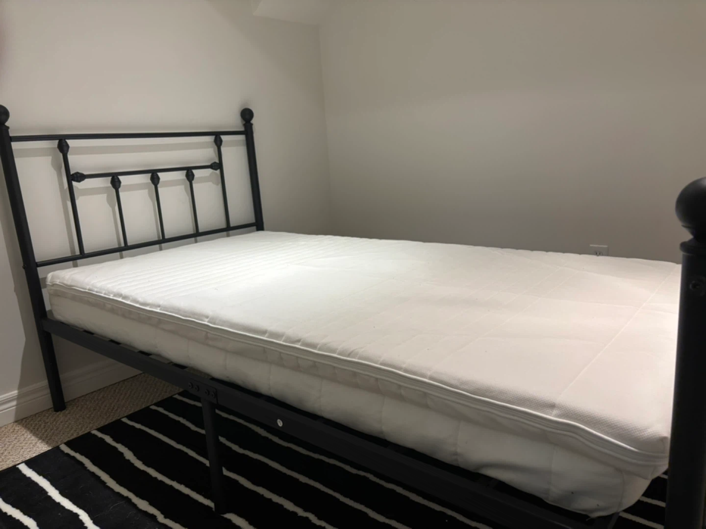 A classic black metal twin bed frame. Sturdy and stylish, it's a great addition to any bedroom! This bed frame is suitable for a twin-sized mattress. Only used for staging. Mattress not included.