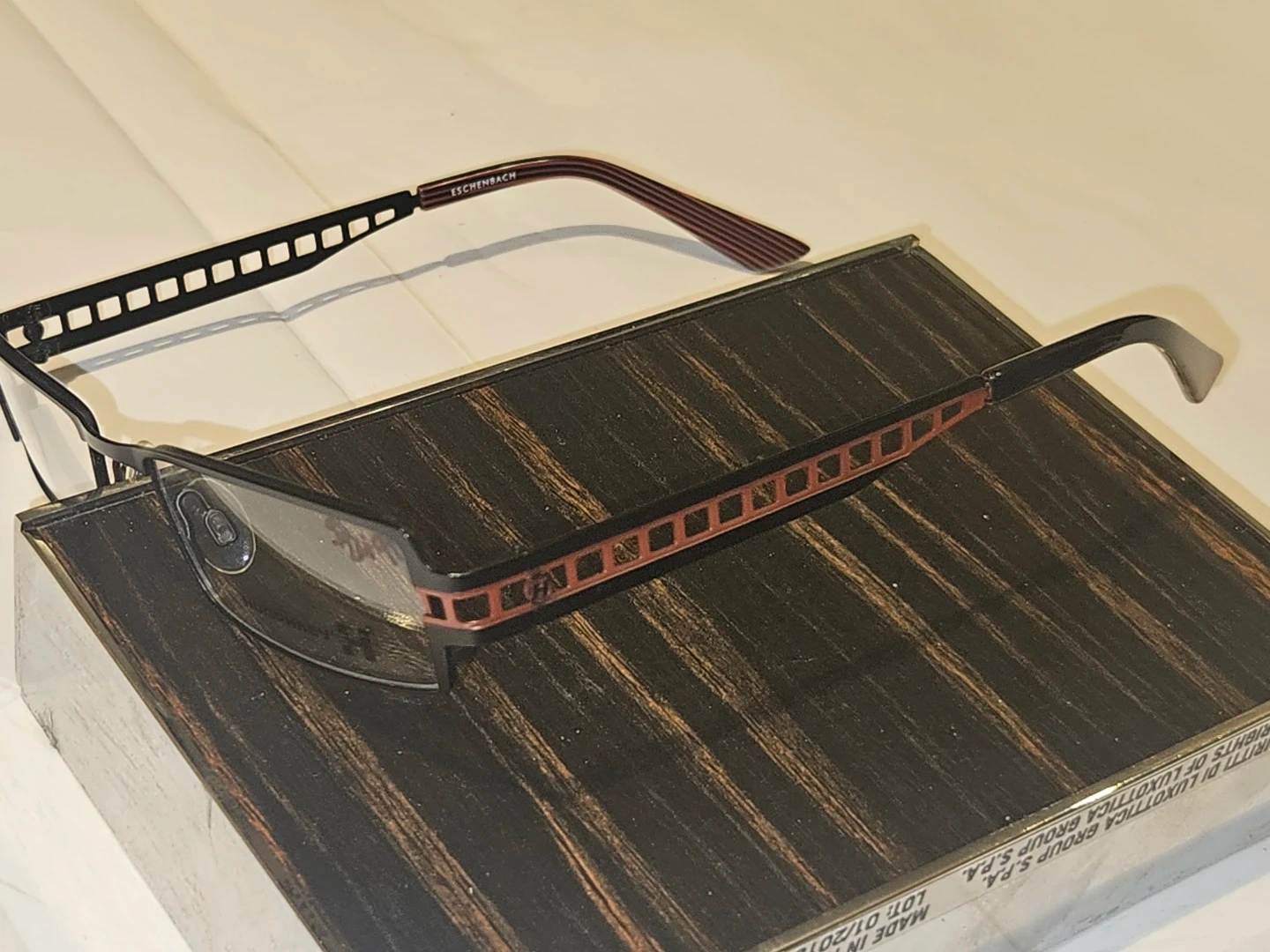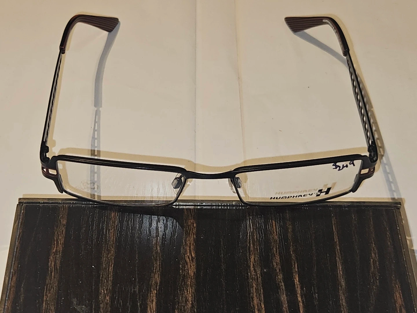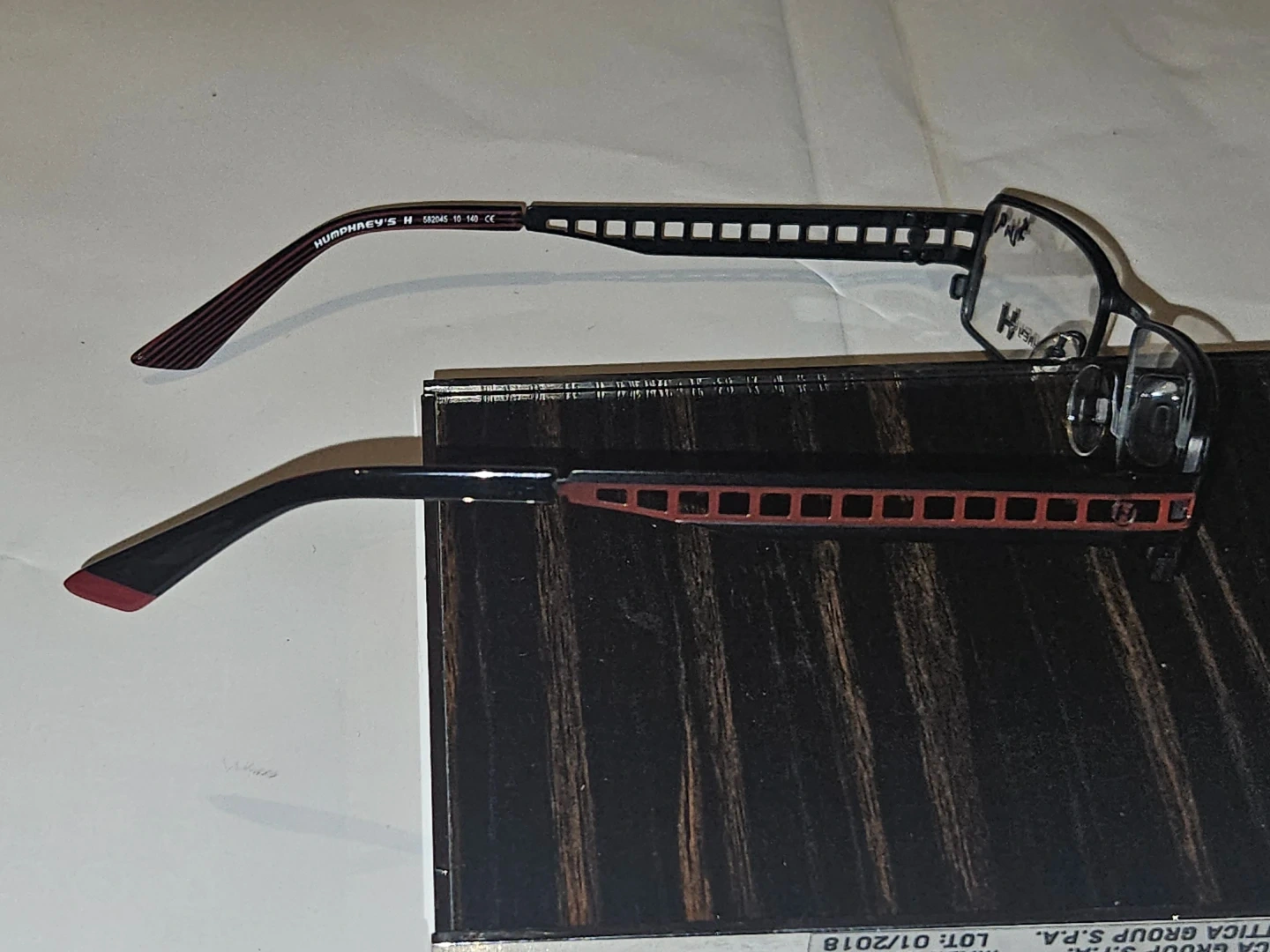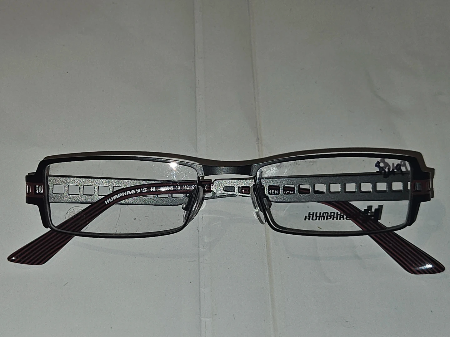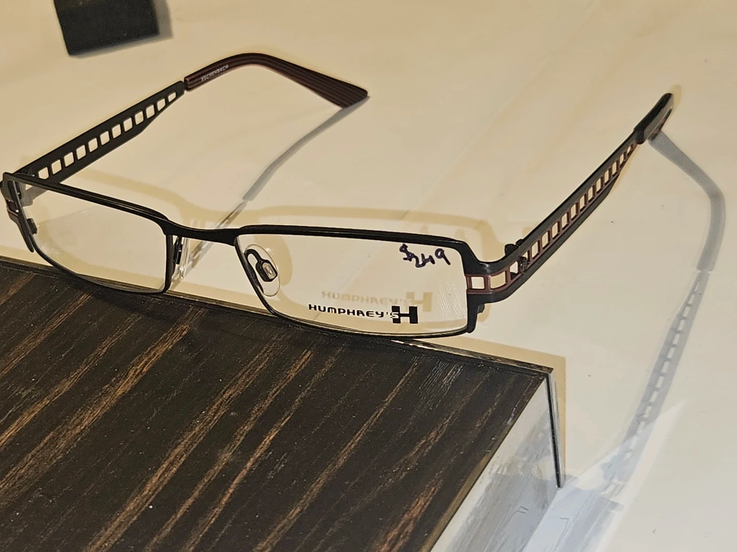 Humphrey's Eyewear glasses frames in black and maroon. The frames are metal with decorative cutouts on the temples. They have a 140mm temple length in dark red, and are designed to fit any type of Prescription lenses.