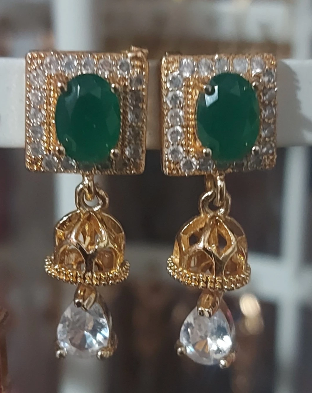 Gold tone drop earrings featuring a square top with a central green oval stone surrounded by small clear stones. Dangling from this is a bell-shaped charm with a teardrop-shaped clear stone at the bottom. These earrings are a lovely accent for any outfit!