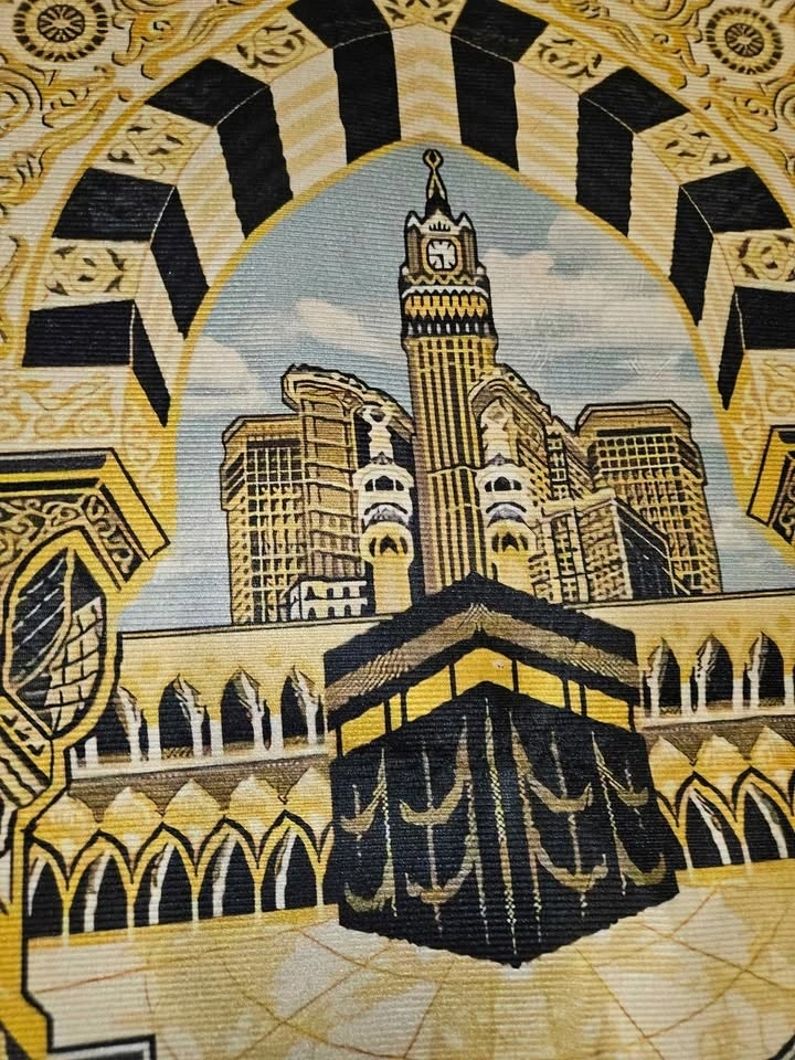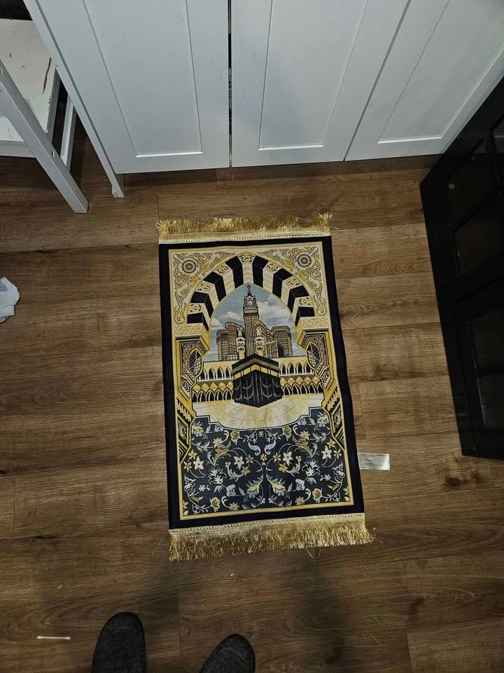 Decorative woven prayer rug featuring an architectural and geometric design with gold fringe detailing. Can be used as a prayer mat, decorative rug, or wall hanging. Well-suited for personal use, display, or as a thoughtful gift. Lightweight and easy to fold or hang. Dimensions: Approx. 35 inches x 20 inches. Clean and in good condition. Minor signs of use only. Please see photos for details. Cash or e-transfer accepted. Local pickup preferred.