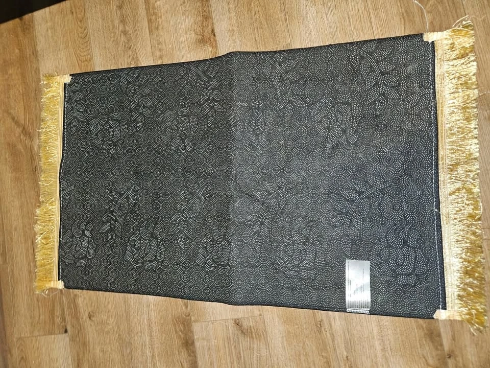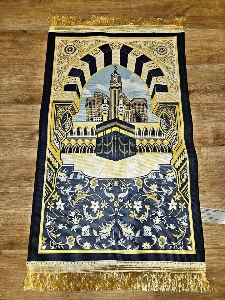 Decorative woven prayer rug featuring an architectural and geometric design with gold fringe detailing. Can be used as a prayer mat, decorative rug, or wall hanging. Well-suited for personal use, display, or as a thoughtful gift. Lightweight and easy to fold or hang. Dimensions: Approx. 35 inches x 20 inches. Clean and in good condition. Minor signs of use only. Please see photos for details. Cash or e-transfer accepted. Local pickup preferred.