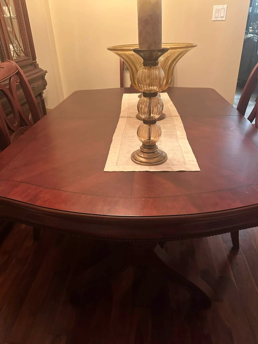 Beautiful solid wood dining set including a large china cabinet, dining table, and four chairs. The china cabinet features glass doors and ample storage. The table is oval-shaped with a rich wood finish. Chairs have upholstered seats.