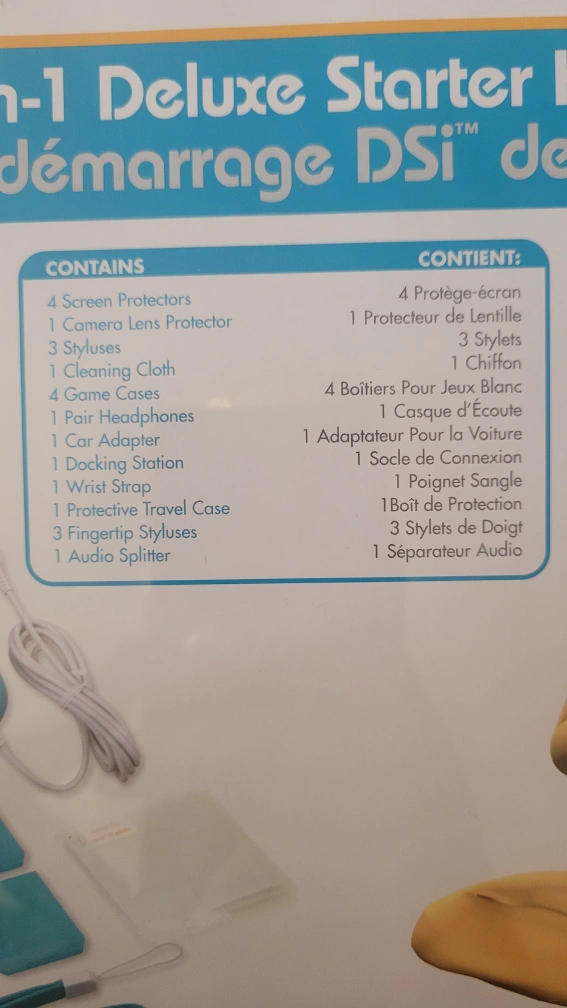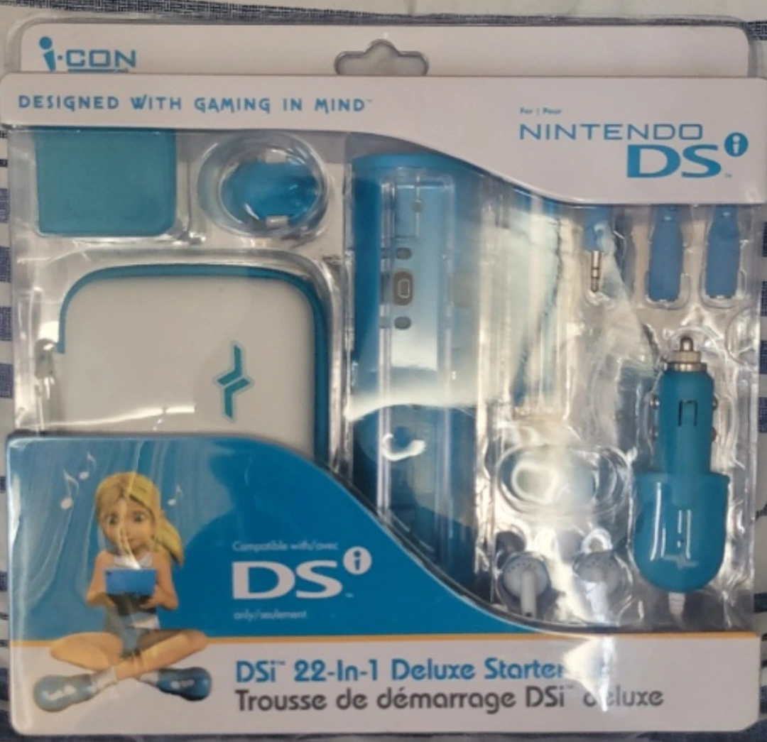 DSi 22-in-1 Deluxe Starter Kit. Includes screen protectors, camera lens protector, cleaning cloth, styluses, game cases, headphones, car adapter, docking station, wrist strap, travel case, fingertip styluses, and audio splitter.
