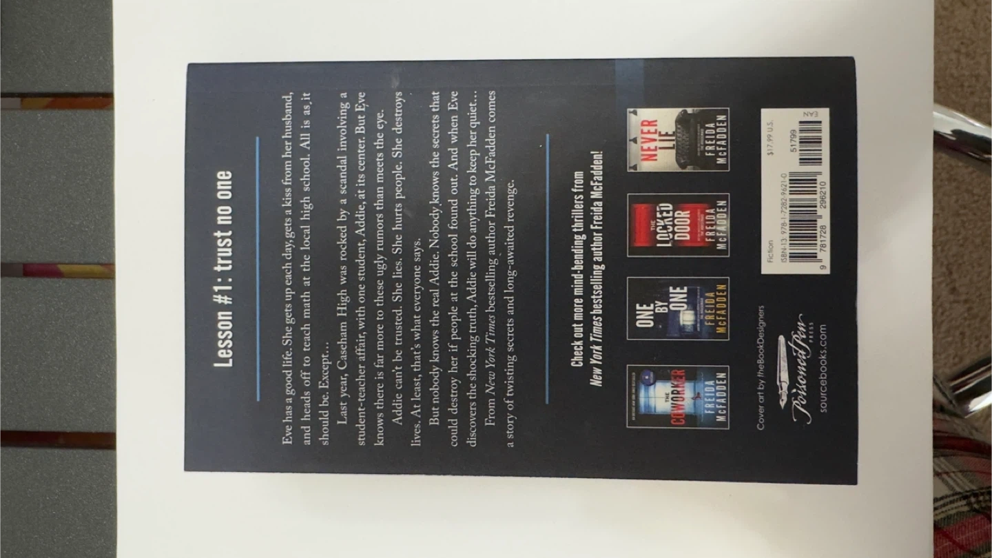This is Freida McFadden's "The Teacher", a thrilling fiction novel. It's a story about a teacher's dark secrets and a student's pursuit of the truth. Pick it up for a suspenseful read!