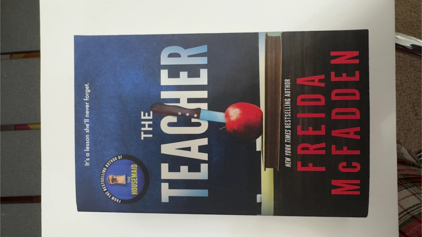 This is Freida McFadden's "The Teacher", a thrilling fiction novel. It's a story about a teacher's dark secrets and a student's pursuit of the truth. Pick it up for a suspenseful read!