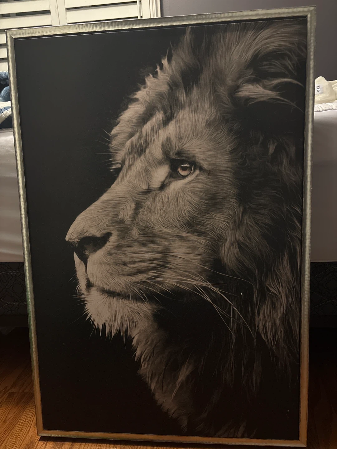 This framed wall art features a striking black and white image of a lion's profile. It's framed in a brushed silver-tone metal. Ready to hang for your home decor!