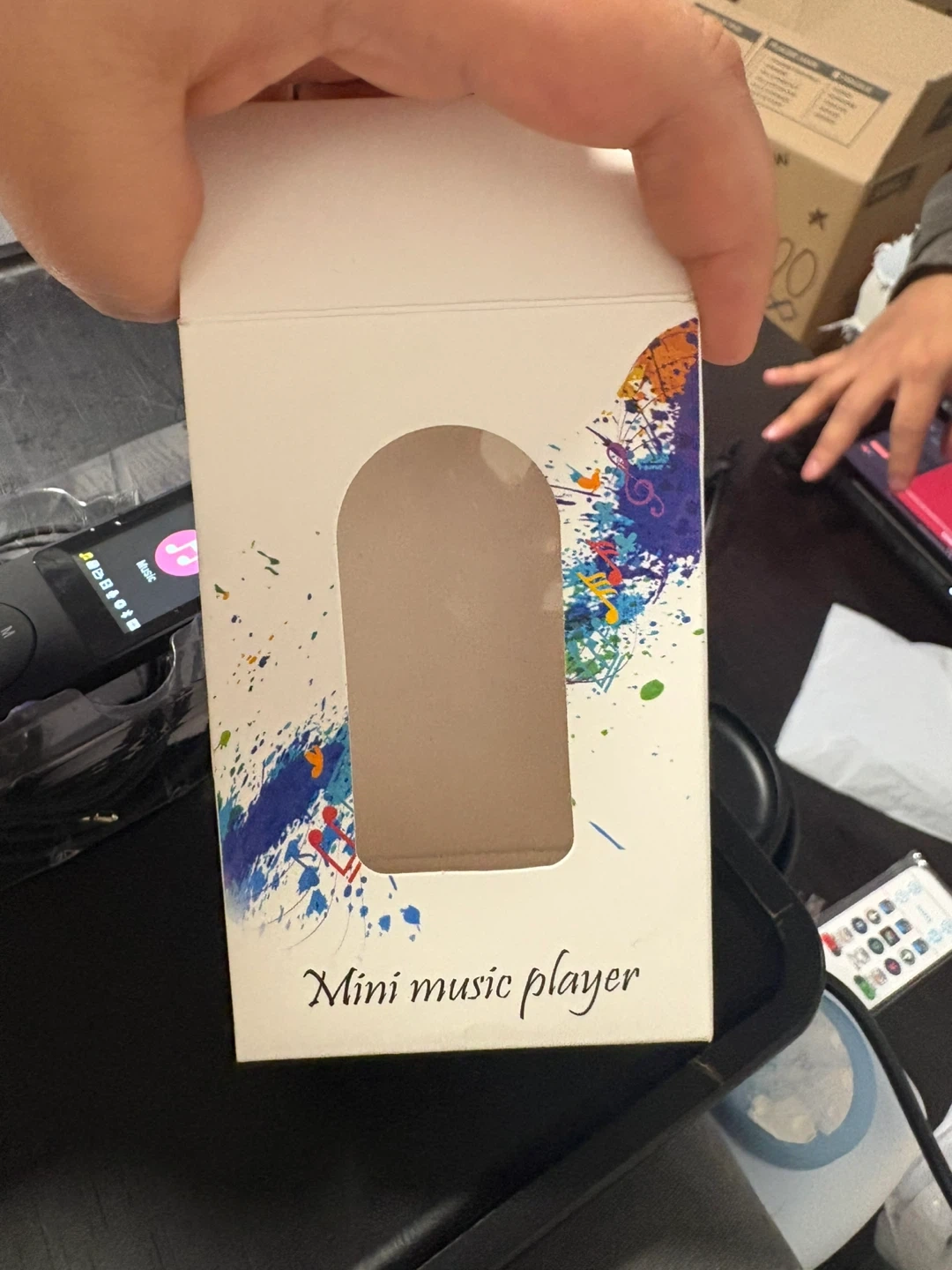This is a mini portable music player. It's black and comes with a charging cable. Perfect for listening to tunes on the go!