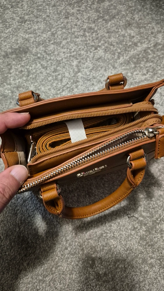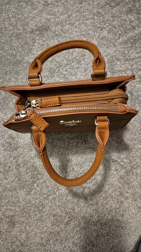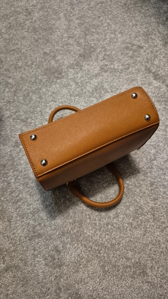 Small brown handbag. Top handle and zipper closure. Removable shoulder strap. Subtle branding. Excellent condition.