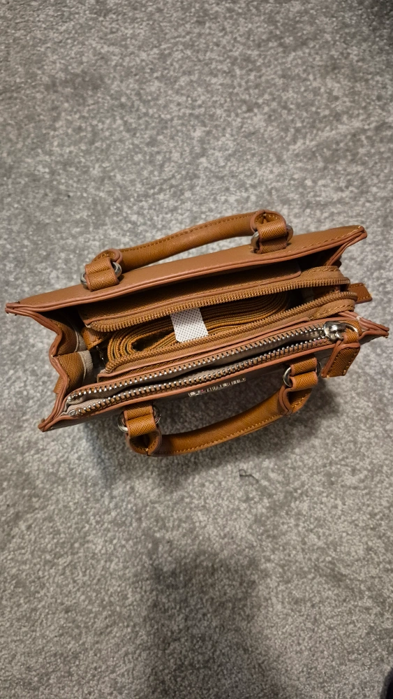 Small brown handbag. Top handle and zipper closure. Removable shoulder strap. Subtle branding. Excellent condition.