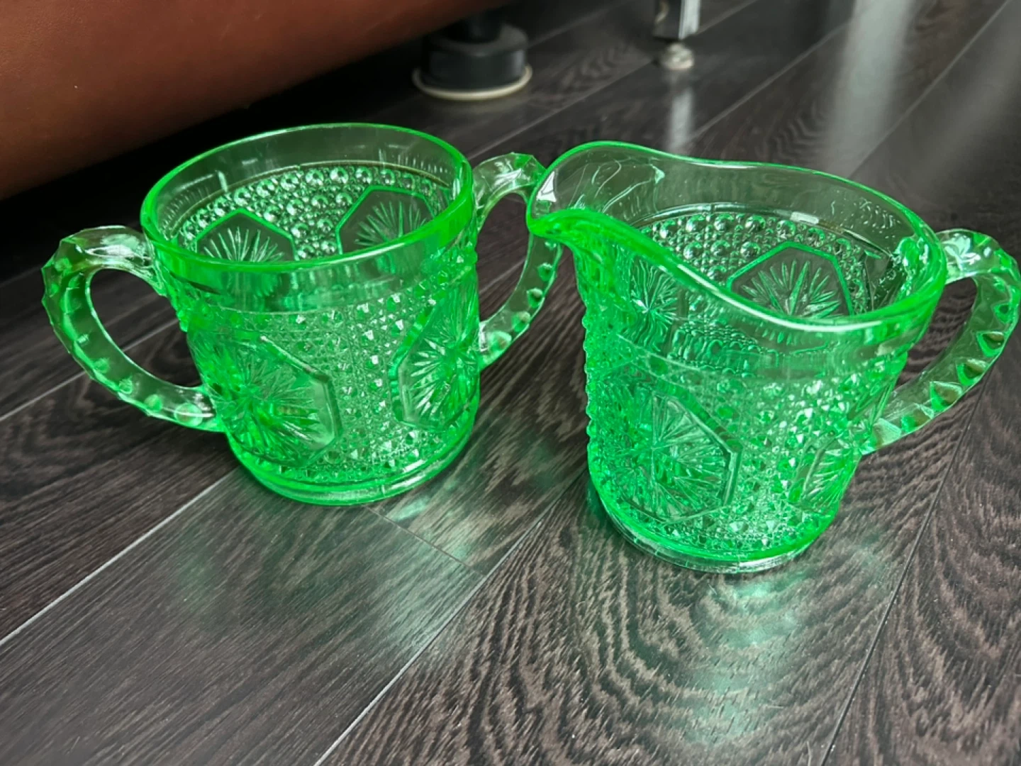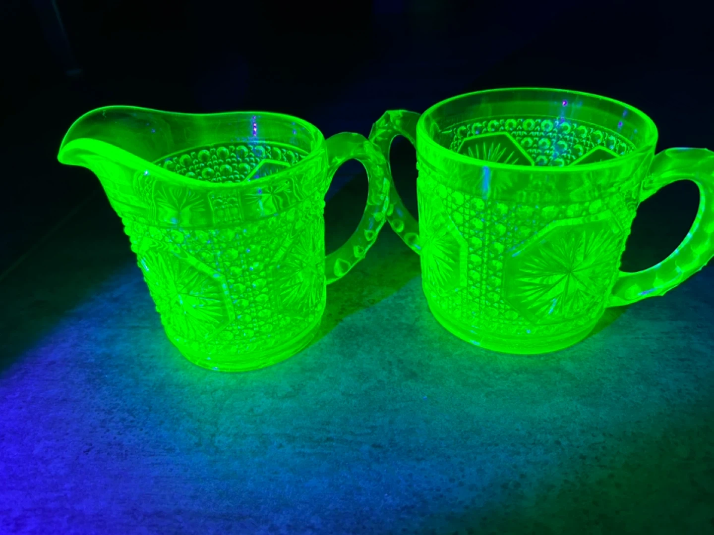 Selling a vintage uranium glass creamer and sugar set. These glow beautifully under UV light! They have a lovely decorative pattern and would make a great addition to any collection or a charming touch to your table setting. They're in great condition.