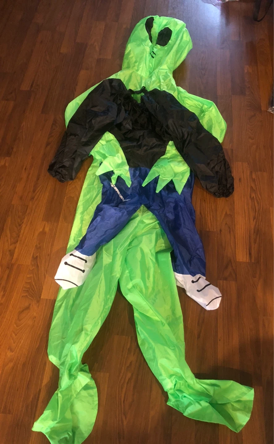 Get ready for Halloween with this fun alien inflatable costume for kids! It's a child one size costume and includes the full body suit with attached hood, gloves, and shoe covers. Perfect for trick-or-treating or costume parties! I’m sorry, but I really don’t know what age it is for.