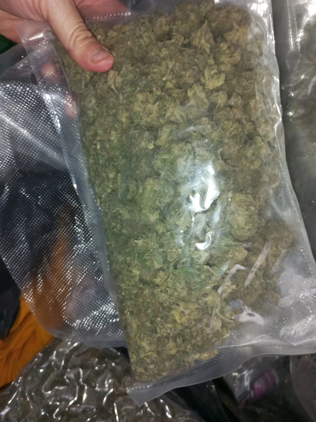 Appears to be a hybrid strain with a potent aroma and dense buds.