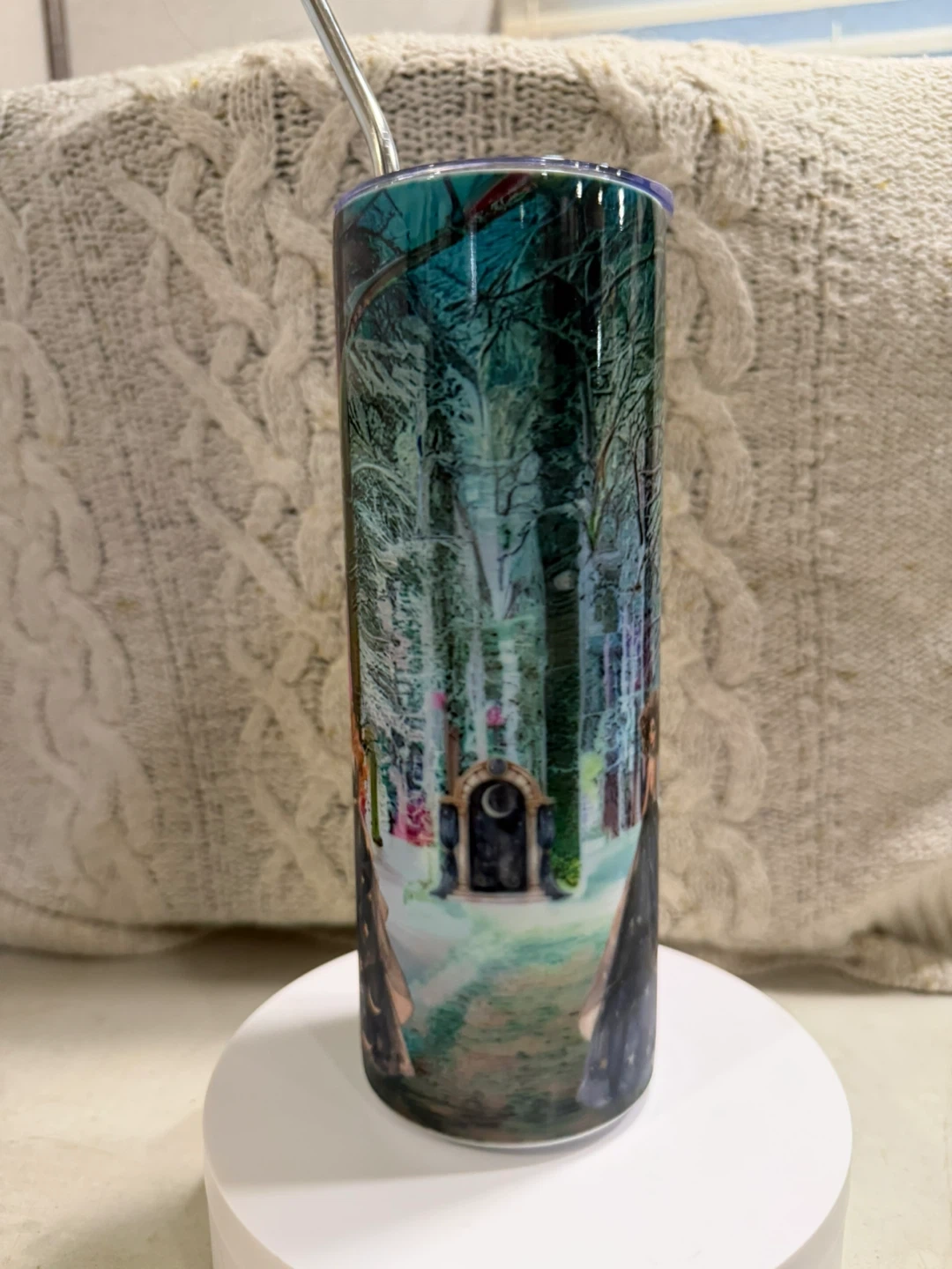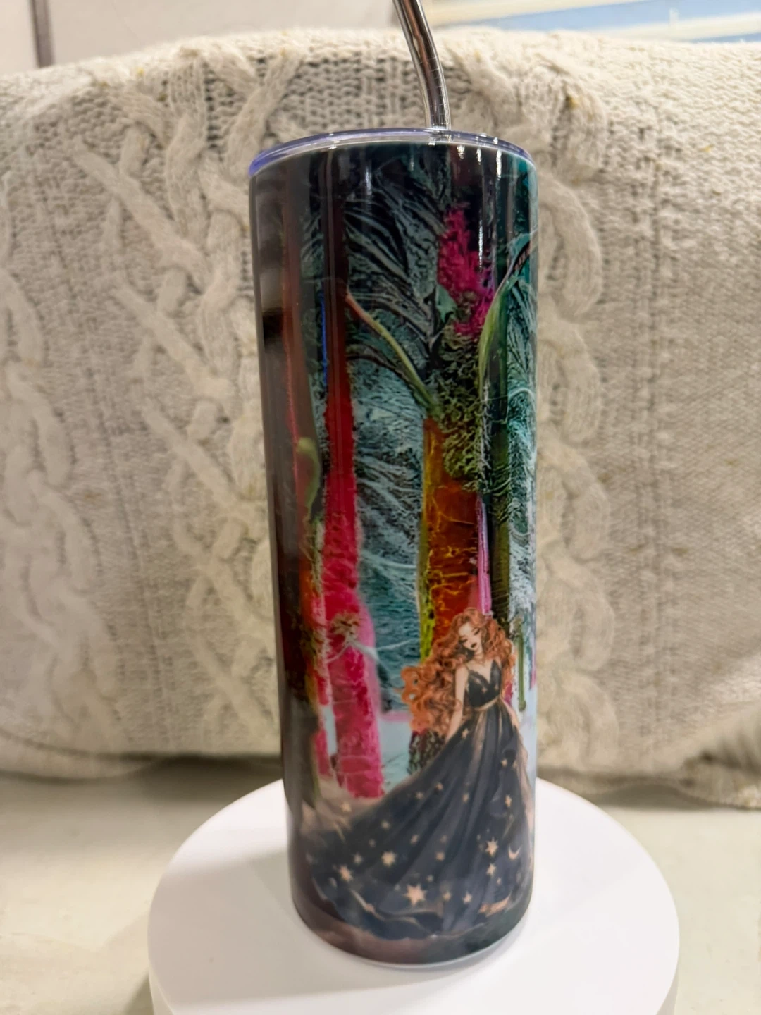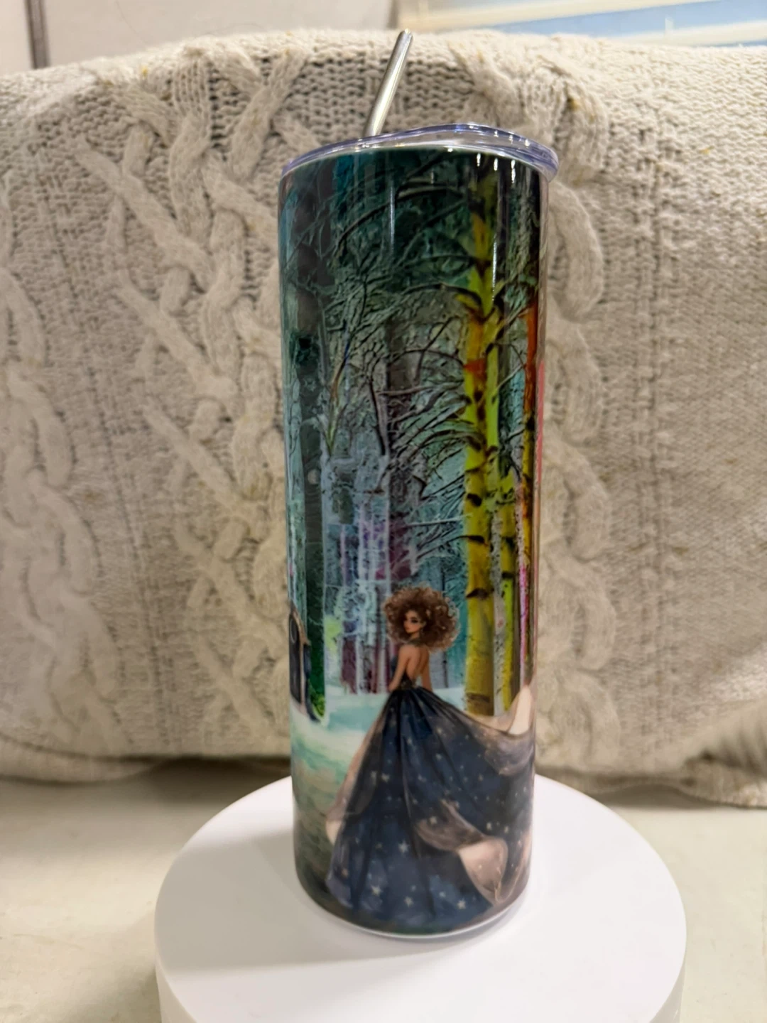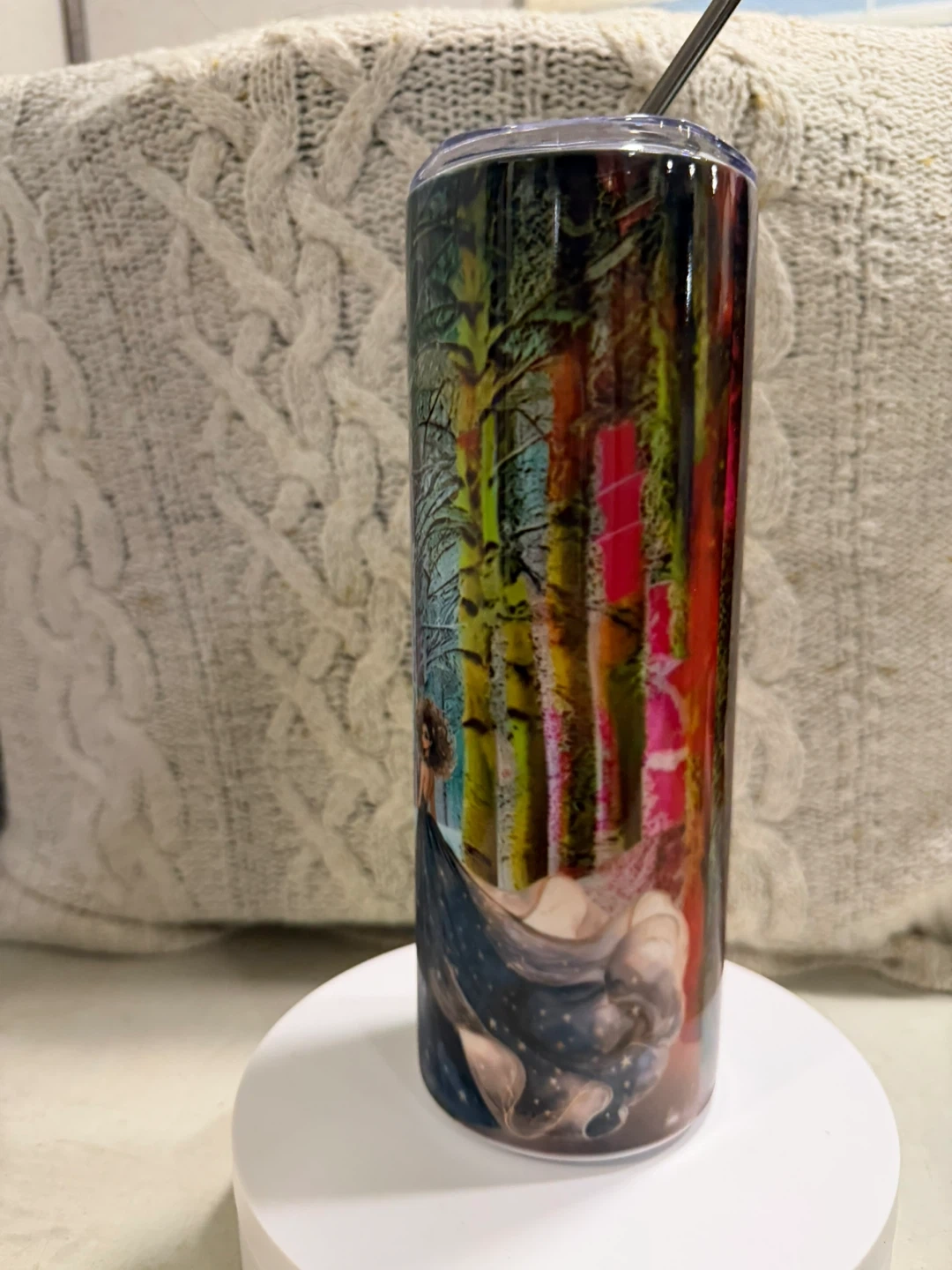 This artistic Winter Wonderland tumbler features a vibrant forest scene with a woman in a starry dress. It's perfect for keeping your drinks hot or cold on the go. The metal straw is included for easy sipping! I am an Inuk/Indigenous Designer