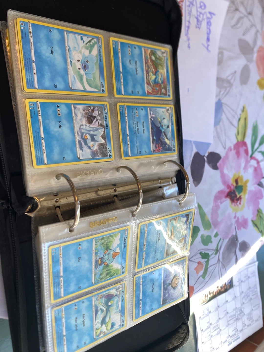 Collection of assorted Pokemon trading cards featuring characters like Chilly, Cubchoo, Bergmite, and Chewtle. Card details include damage points and attack names. These cards are stored in a Graffo binder.