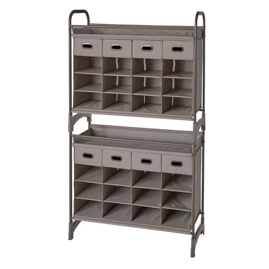This modular 16-compartment shoe organizer can be stacked on a second unit or paired with a maximize 4-Tier Shelf for a custom organization solution. It includes 4 drawers for storing smaller loose accessories. This unit is extremely versatile in that it can be utilized in any room, entryway, or closet space.