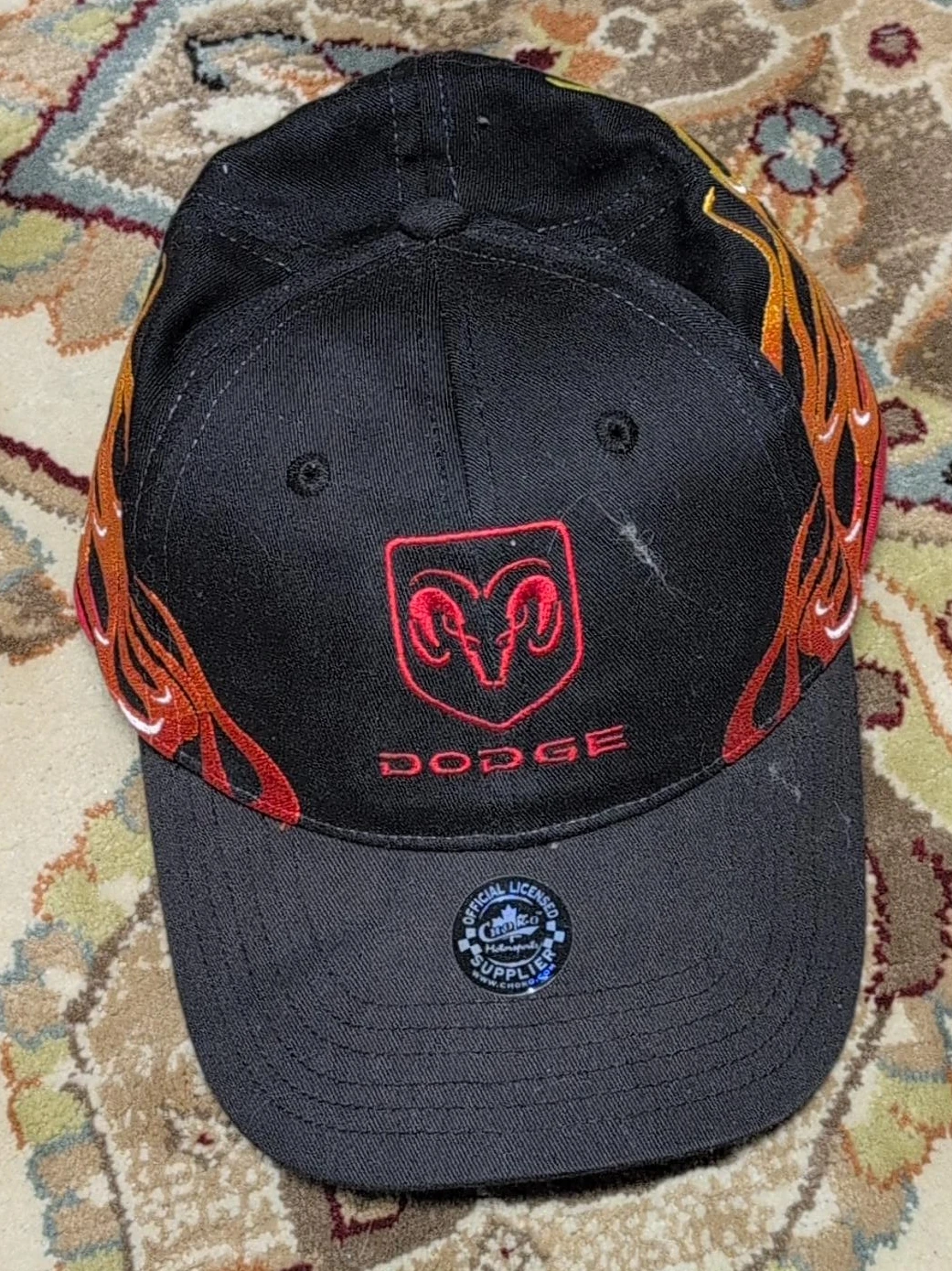 92Selling a Dodge baseball cap in black with cool flame designs on the sides! It features the Dodge logo prominently on the front. A great accessory for any Dodge enthusiast!