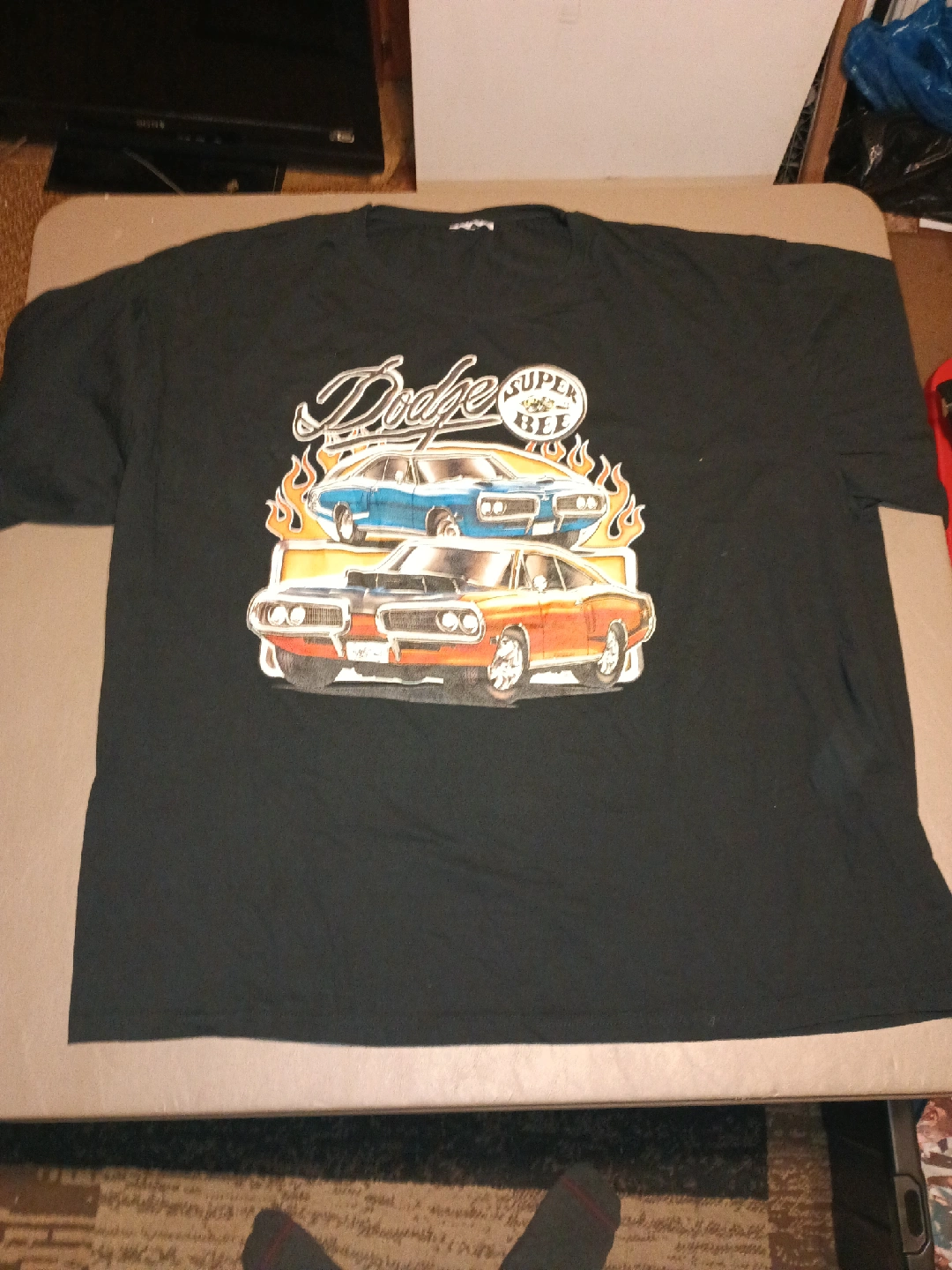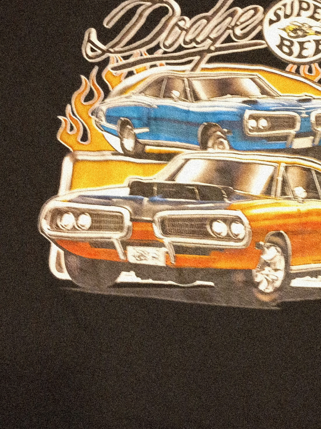 10Cool Dodge Super Bee graphic t-shirt featuring classic car designs! The shirt is black with vibrant blue and orange cars, perfect for any car enthusiast