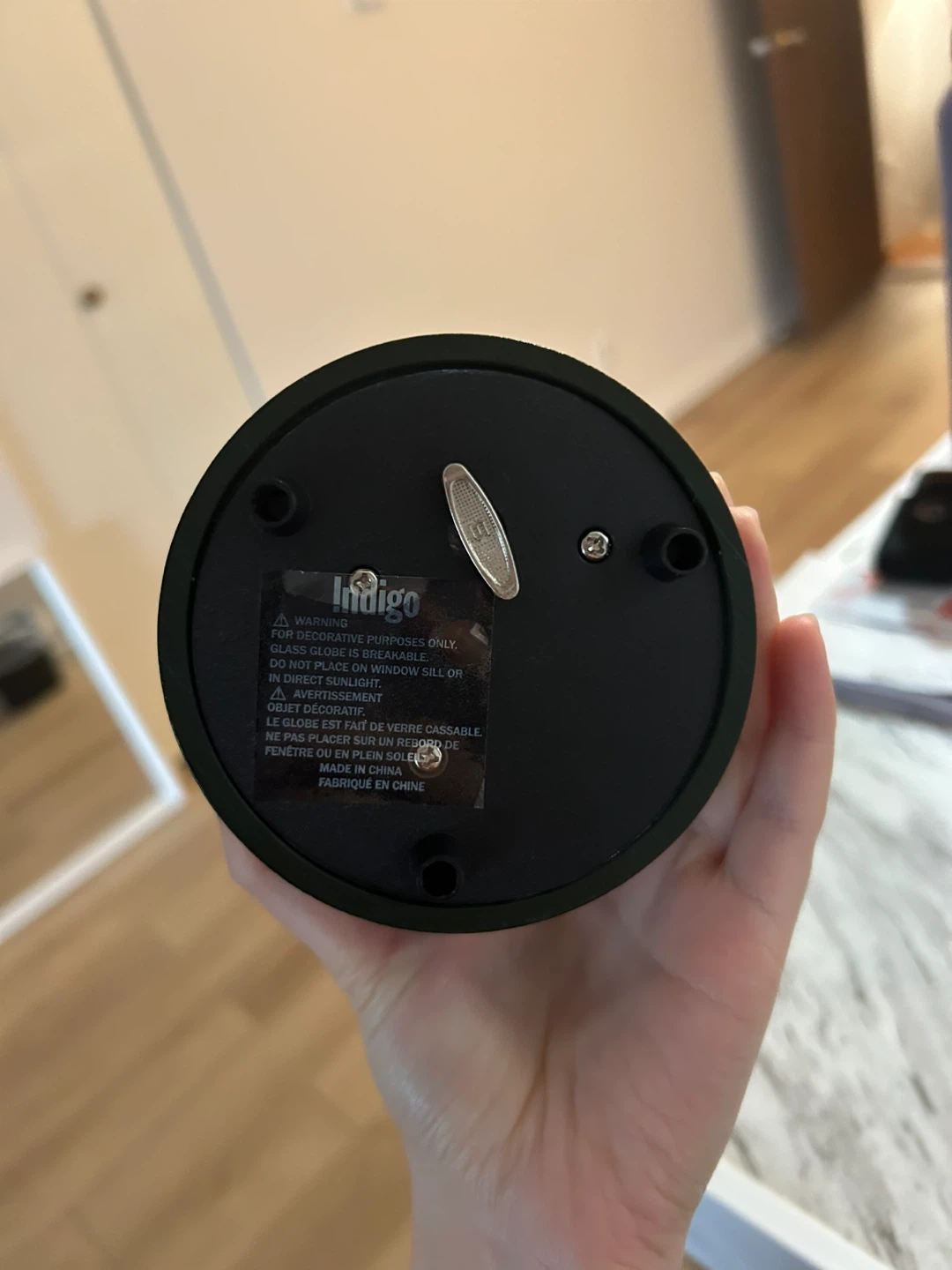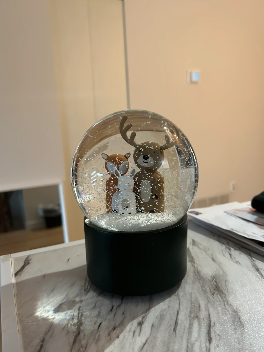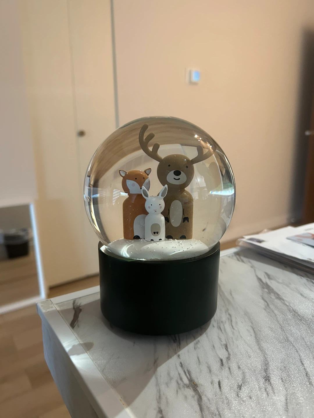 Selling an Indigo snow globe! It features a cute deer, fox, and rabbit family inside. The base is a very dark green colour. Perfect for adding a touch of whimsy to your home decor!