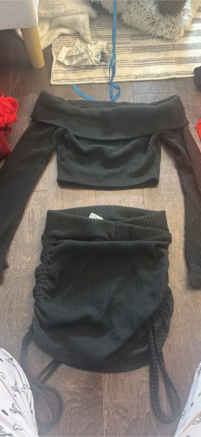 Cute black knit matching set! The top is an off-the-shoulder crop top with long sleeves, and the skirt is a ruched mini skirt with adjustable drawstring ties. Perfect for a night out!