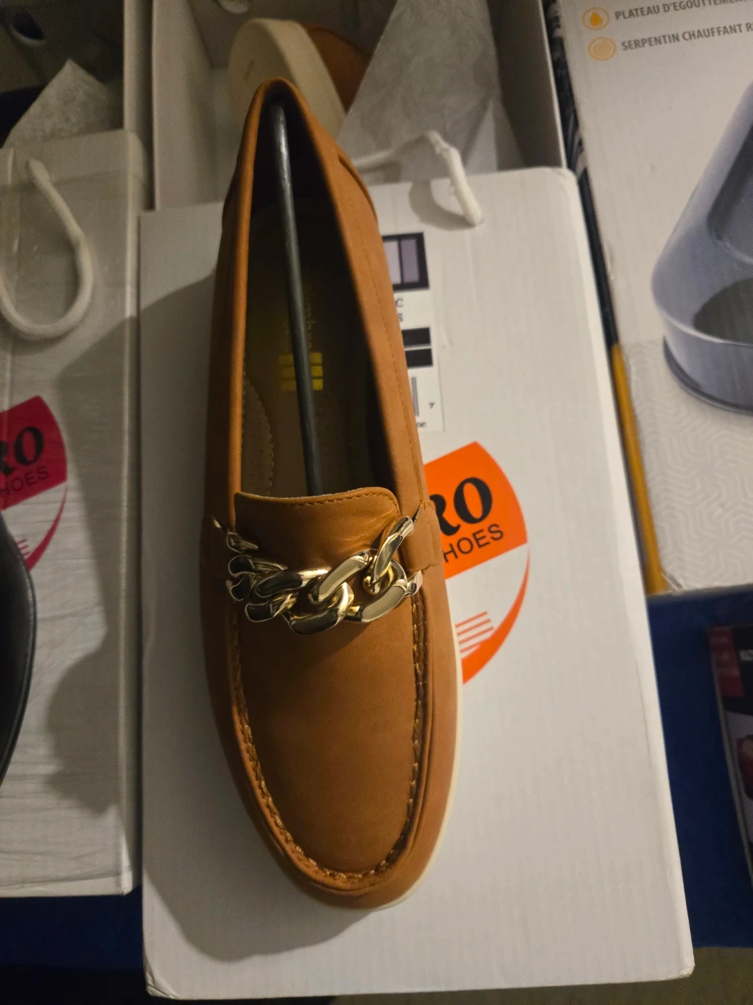 Stylish brown loafers from Euro Shoes! These are in great condition and feature a gold chain detail. Perfect for adding a touch of elegance to your outfit