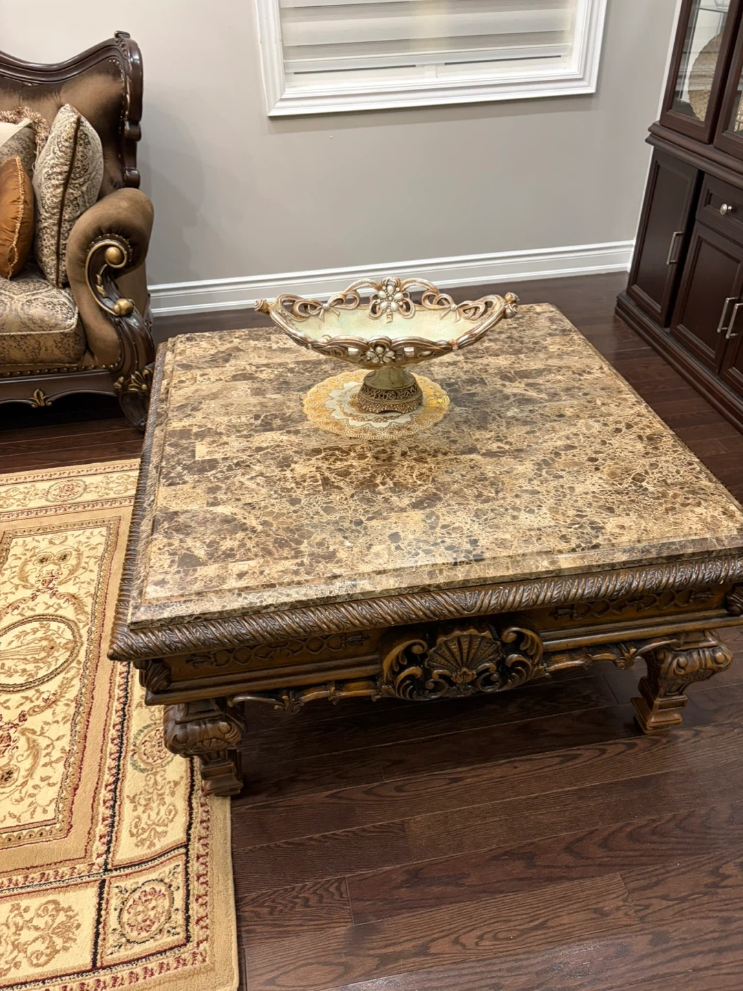 This ornate sofa features a rich brown fabric with intricate patterns. It comes with a set of decorative throw pillows for added comfort and style. The carved wood frame adds a touch of elegance.