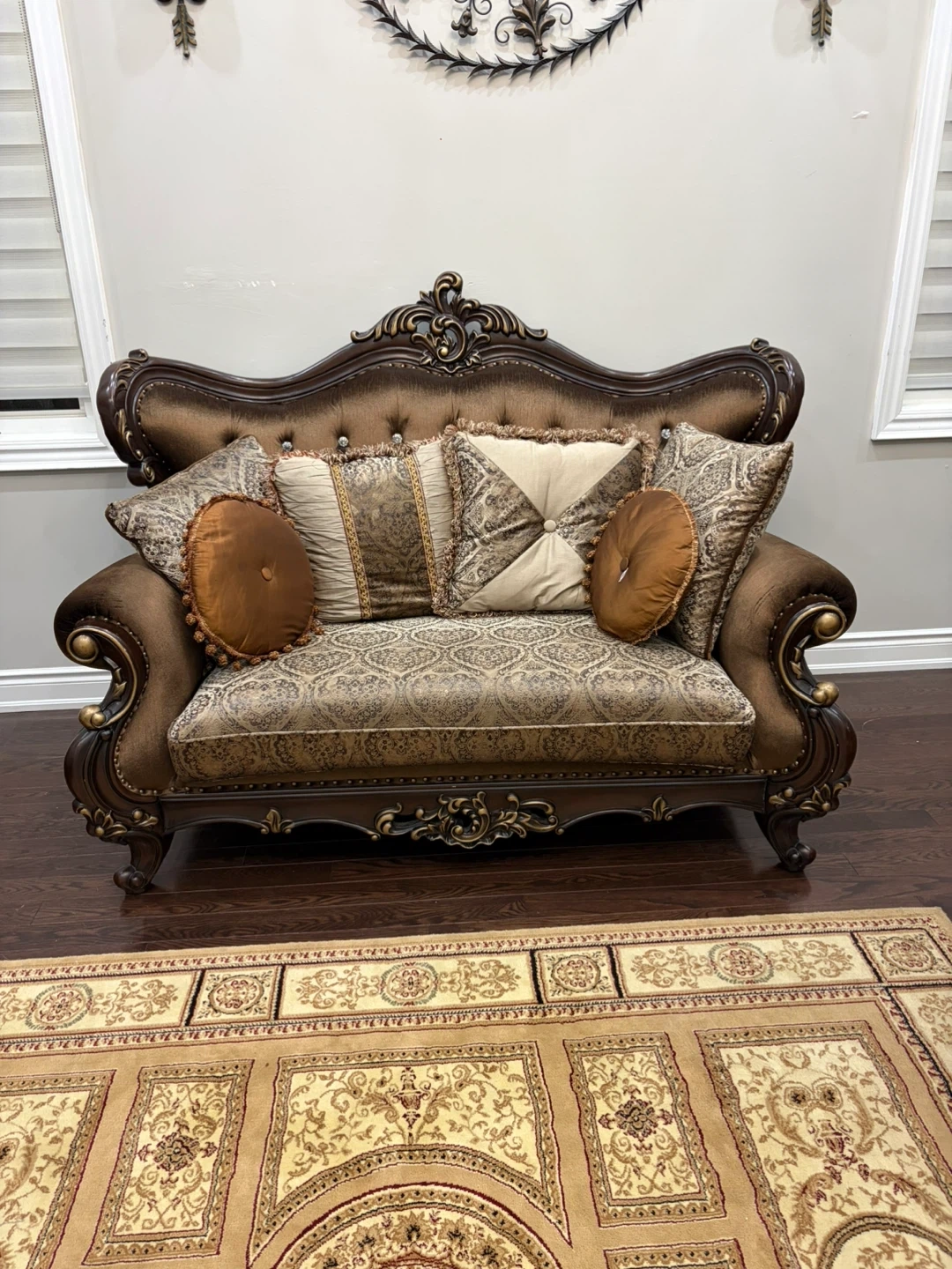 Ornate Brown Sofa with Decorative Pillows
