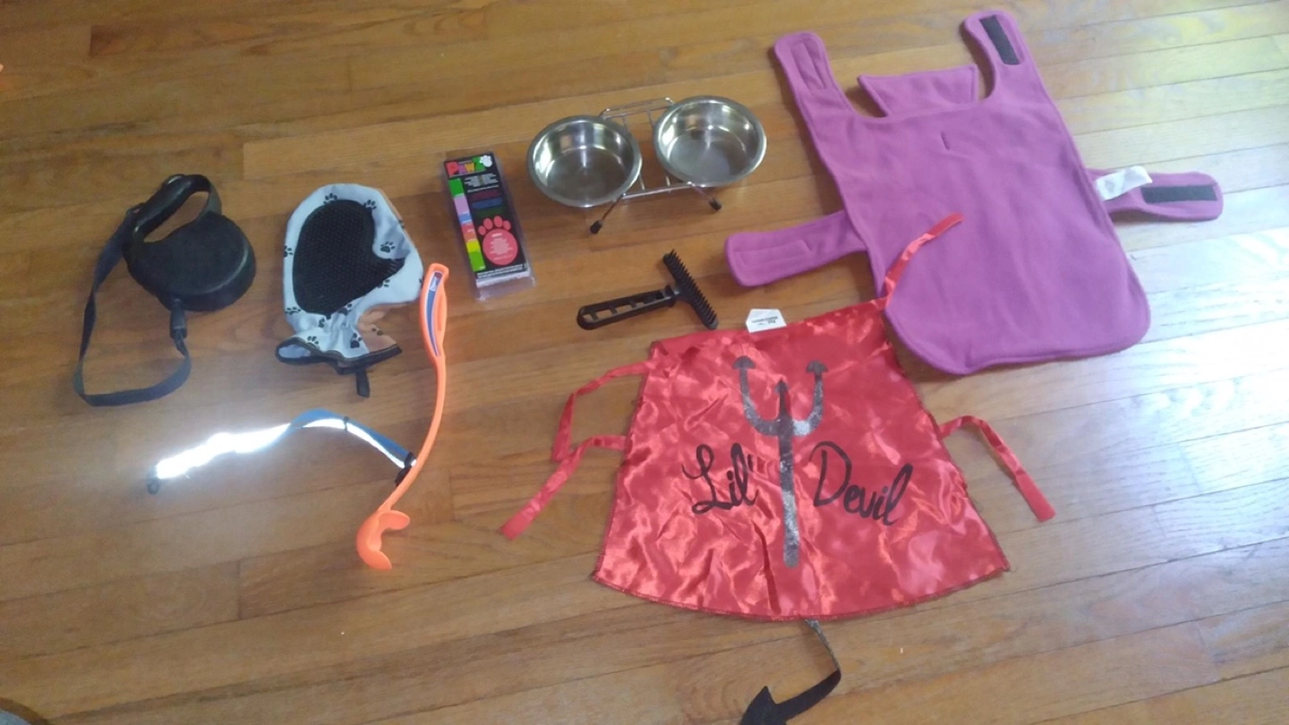 Selling a bundle of various dog accessories! Includes a retractable leash, paw cleaning mitt, dog bowls, a grooming rake, a collar, a ball launcher, and a 'Lil Devil' costume