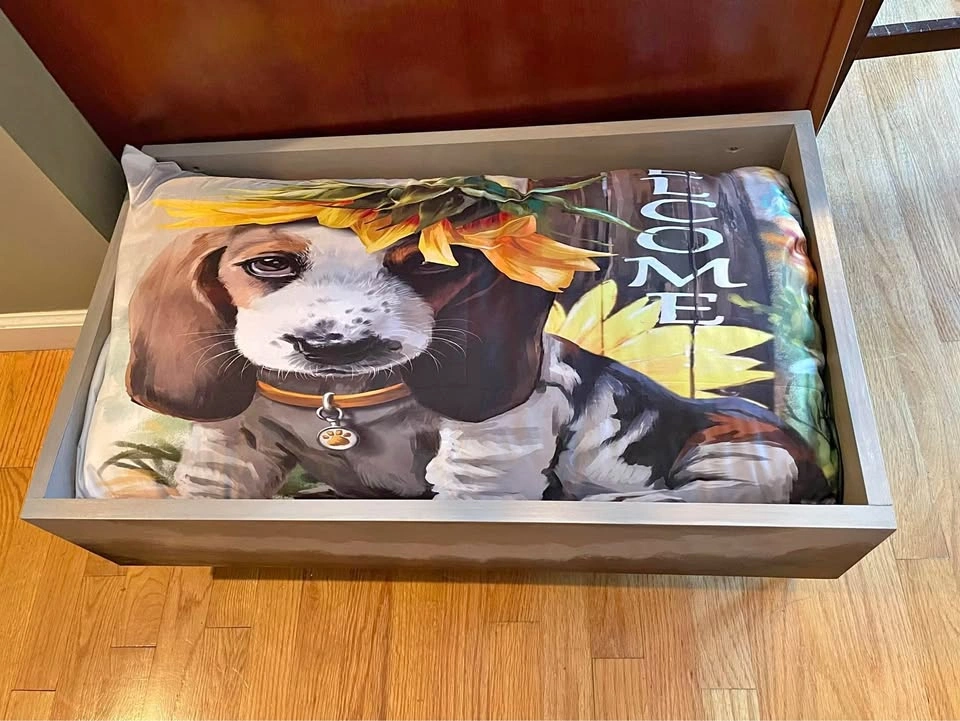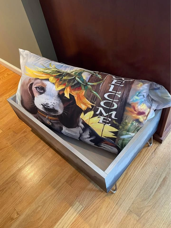 65Dog bed made from solid wood with dove tailed corners, brass hairpin legs and soothing grey to black design. Makes the perfect bed for your Fur-baby, dog or cat. Comes with king sized pillow for comfort. Pillowcase is removable and washable for easy cleaning. Pet bed measures 18” L x 13” W x 11.5” H suitable for medium to small dog or cat. Suzi Custom Furniture. Cash & carry, pick up in Lindenhurst, NY.