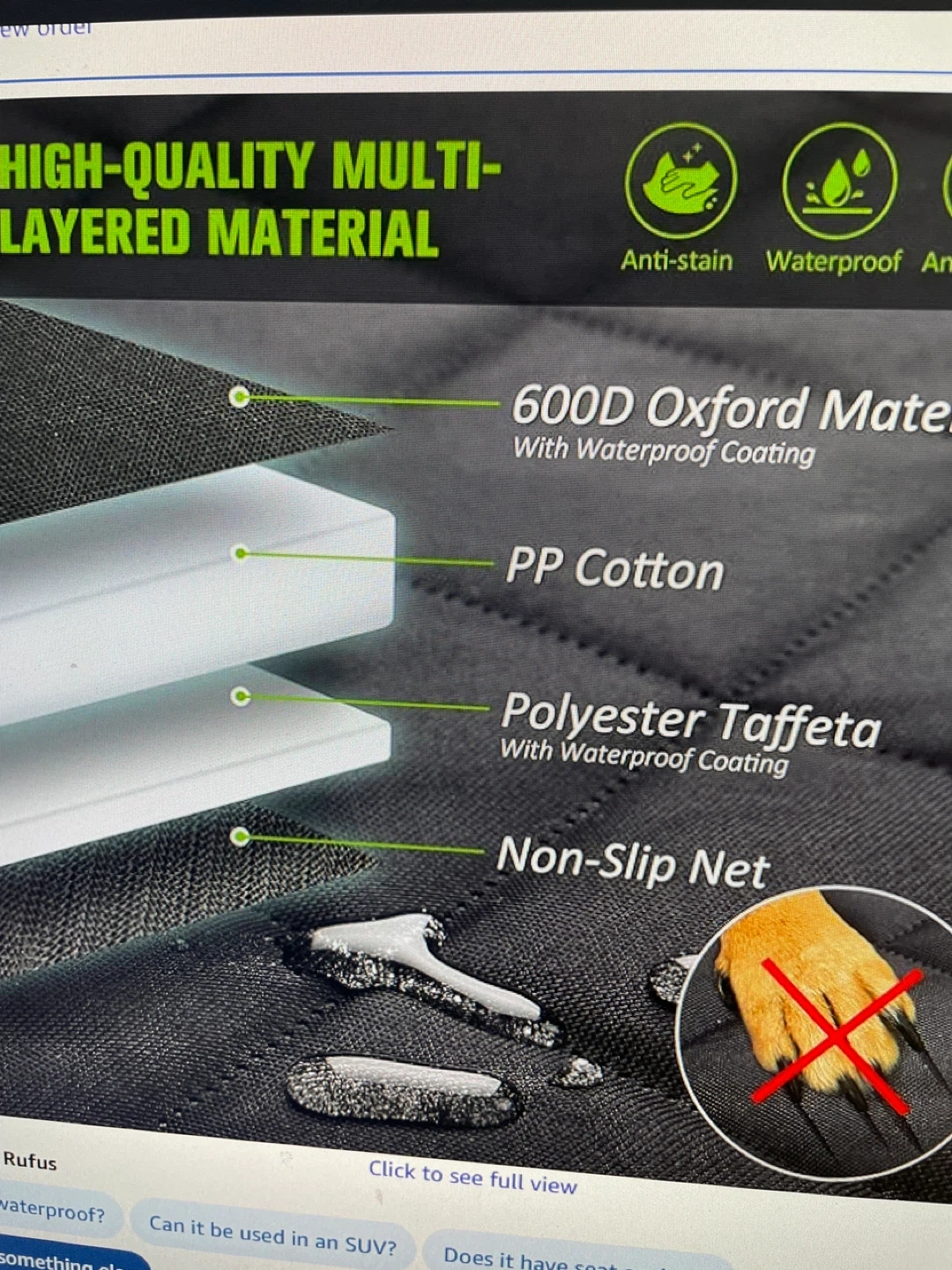 Keep your car clean and your furry friend safe with this dog car seat cover! It's waterproof and has a non-slip net to keep your dog comfortable and secure. - Made with high-quality multi-layered material, including 600D Oxford material with waterproof coating, PP cotton, and polyester taffeta with waterproof coating - Features a visible mesh window for better air circulation and less anxiety for pets - Includes storage pockets for food, snacks, water bottles, and toys - Enhanced stitching for heavy-duty, durable, and non-breakable use