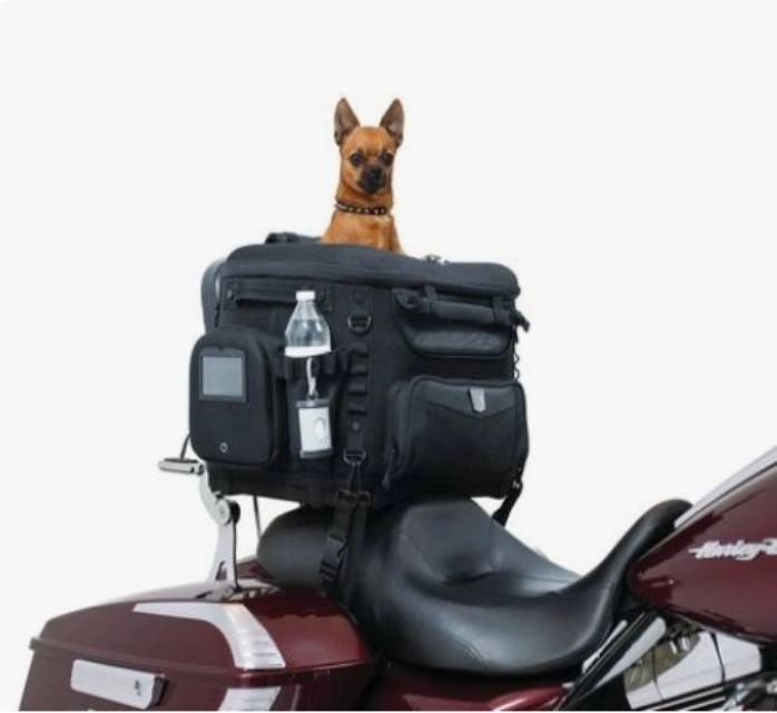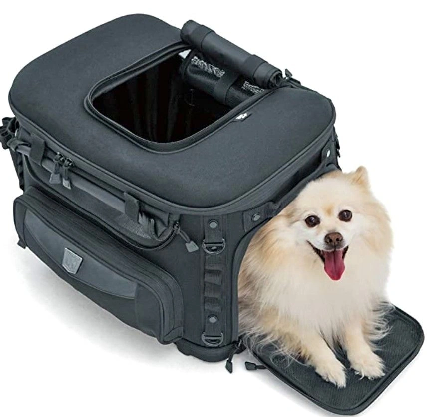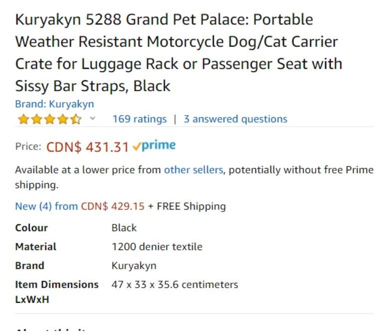 10Internal frame with rigid structural support offers peace of mind knowing your pet is protected; UV-rated weather-resistant 1200 denier textile material with removable rain cover. Sissy bar straps, multiple D-rings, and adjustable straps offer easy, secure mounting options; Features side-mounted carrying handles and a removable shoulder strap for easy portability off the bike. Easy-clean removable foam cushion offers a comfortable ride for your pet; Amenities include an internal adjustable leash, 2 dishes, and a removable stash pouch. Top window opens allowing your pet to pop their head out and 4 mesh windows for viewing and optimum ventilation. Measures 18. 5" L x 13" W x 14" H, with 2, 700 cubic inches (44 liters) by volume; Recommended pet weight capacity is up-to 20 pounds. Let me know if you're interested!