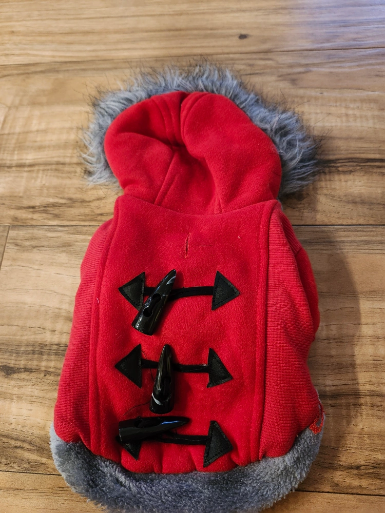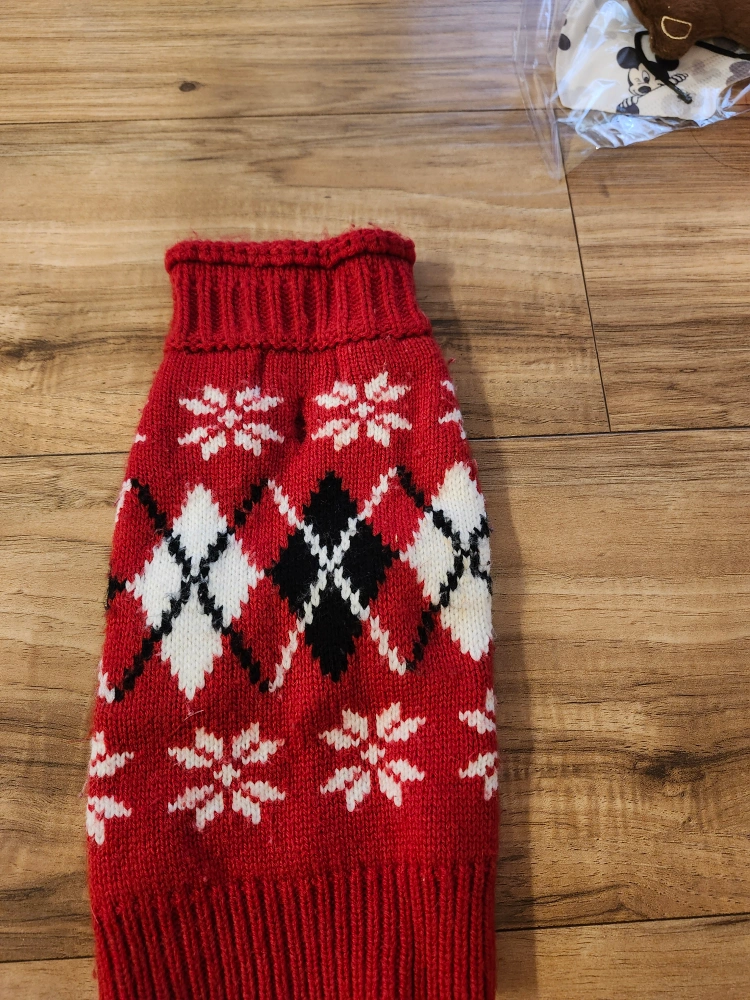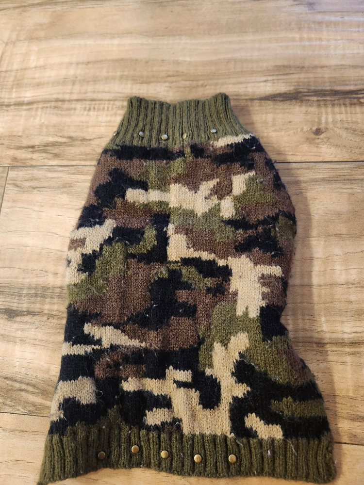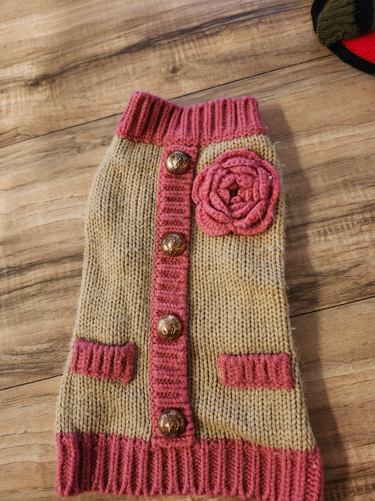 Bundle of dog clothes. One knitted sweater, one fleece jacket, one red sweater with a hood, one red sweater with a snowflake pattern, and one camouflage sweater. Bundle of harnesses. All great condition.